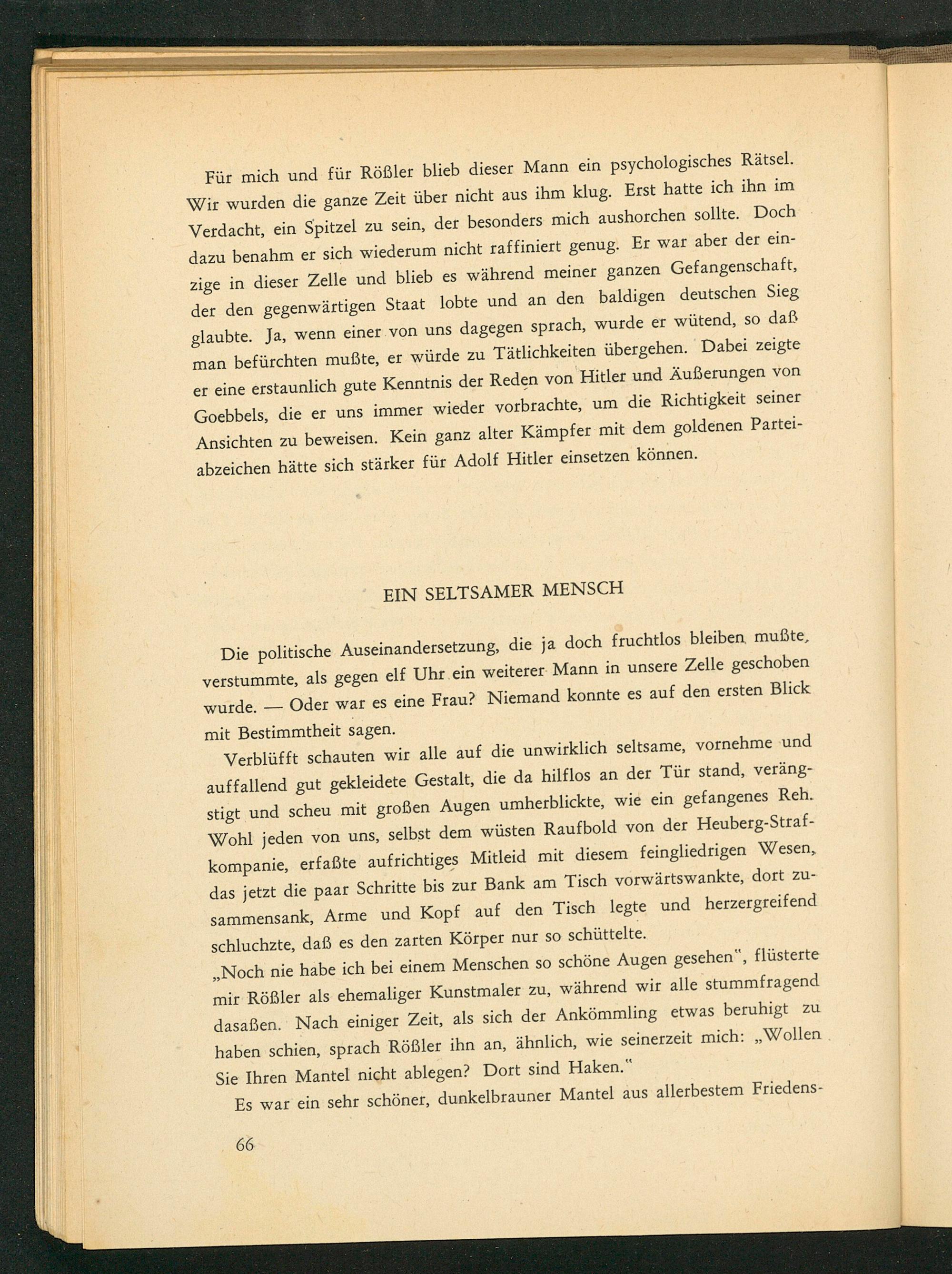 Für mich und für Rößler blieb dieser Mann ein psychologisches Rätsel. Wir wurden die ganze Zeit über nicht aus ihm klug. Erst hatte ich ihn im Verdacht, ein Spitzel zu sein, der besonders mich aushorchen sollte. Doch dazu benahm er sich wiederum nicht raffiniert genug. Er war aber der einzige in dieser Zelle und blieb es während meiner ganzen Gefangenschaft, der den gegenwärtigen Staat lobte und an den baldigen deutschen Sieg glaubte. Ja, wenn einer von uns dagegen sprach, wurde er wütend, so daß man befürchten mußte, er würde zu Tätlichkeiten übergehen. Dabei zeigte er eine erstaunlich gute Kenntnis der Reden von Hitler und Äußerungen von Goebbels , die er uns immer wieder vorbrachte, um die Richtigkeit seiner Ansichten zu beweisen. Kein ganz alter Kämpfer mit dem goldenen Parteiabzeichen hätte sich stärker für Adolf Hitler einsetzen können.