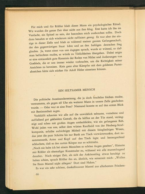 ,, Noch nie habe ich bei einem Menschen so schöne Augen gesehen", flüsterte mir Röẞler als ehemaliger Kunstmaler zu, während wir alle stummfragend dasaßen. Nach einiger Zeit, als sich der Ankömmling etwas beruhigt zu haben schien, sprach Rößler ihn an, ähnlich, wie seinerzeit mich: ,, Wollen Sie Ihren Mantel nicht ablegen? Dort sind Haken."