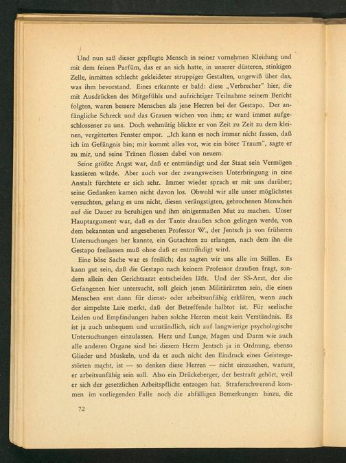 Seine größte Angst war, daß er entmündigt und der Staat sein Vermögen kassieren würde. Aber auch vor der zwangsweisen Unterbringung in eine Anstalt fürchtete er sich sehr. Immer wieder sprach er mit uns darüber; seine Gedanken kamen nicht davon los. Obwohl wir alle unser möglichstes versuchten, gelang es uns nicht, diesen verängstigten, gebrochenen Menschen auf die Dauer zu beruhigen und ihm einigermaßen Mut zu machen. Unser Hauptargument war, daß es der Tante draußen schon gelingen werde, von dem bekannten und angesehenen Professor W., der Jentsch ja von früheren Untersuchungen her kannte, ein Gutachten zu erlangen, nach dem ihn die Gestapo freilassen muß ohne daß er entmündigt wird.
