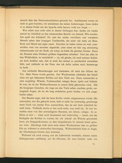 Aus solcherlei Betrachtungen und Gedanken riß mich das Öffnen der Tür. Mein Name wurde gerufen. Der Wachtmeister schüttelte den Inhalt eines mir gut bekannten Koffers auf dem Tisch aus. Dann untersuchte er alles sorgfältig: Wäsche, Toiletteartikel, belegte Brote, Äpfel und Gebäck. Es war, als ob der Weihnachtsmann in unsere Zelle gekommen wäre. Alle die hungrigen Gestalten, die rings um den Tisch saßen, machten große, verlangende Augen, als sie die lang entbehrten guten Sachen vor sich ausgebreitet sahen.