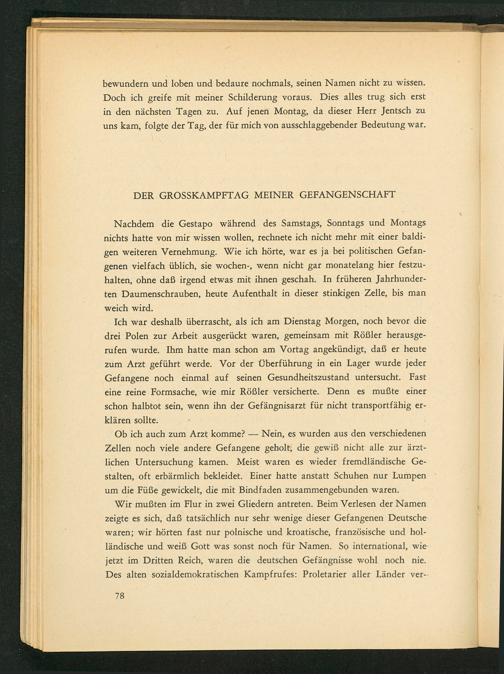 Nachdem die Gestapo während des Samstags, Sonntags und Montags nichts hatte von mir wissen wollen, rechnete ich nicht mehr mit einer baldigen weiteren Vernehmung. Wie ich hörte, war es ja bei politischen Gefangenen vielfach üblich, sie wochen-, wenn nicht gar monatelang hier festzuhalten, ohne daß irgend etwas mit ihnen geschah. In früheren Jahrhunderten Daumenschrauben, heute Aufenthalt in dieser stinkigen Zelle, bis man weich wird.