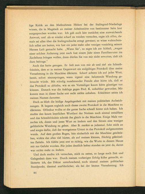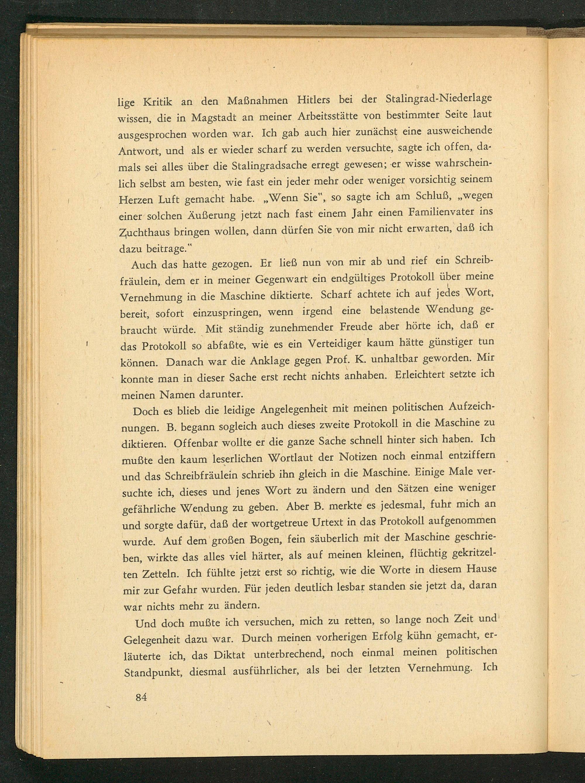 Auch das hatte gezogen. Er ließ nun von mir ab und rief ein Schreibfräulein, dem er in meiner Gegenwart ein endgültiges Protokoll über meine Vernehmung in die Maschine diktierte. Scharf achtete ich auf jedes Wort, bereit, sofort einzuspringen, wenn irgend eine belastende Wendung gebraucht würde. Mit ständig zunehmender Freude aber hörte ich, daß er das Protokoll so abfaßte, wie es ein Verteidiger kaum hätte günstiger tun können. Danach war die Anklage gegen Prof. K. unhaltbar geworden. Mir konnte man in dieser Sache erst recht nichts anhaben. Erleichtert setzte ich meinen Namen darunter.