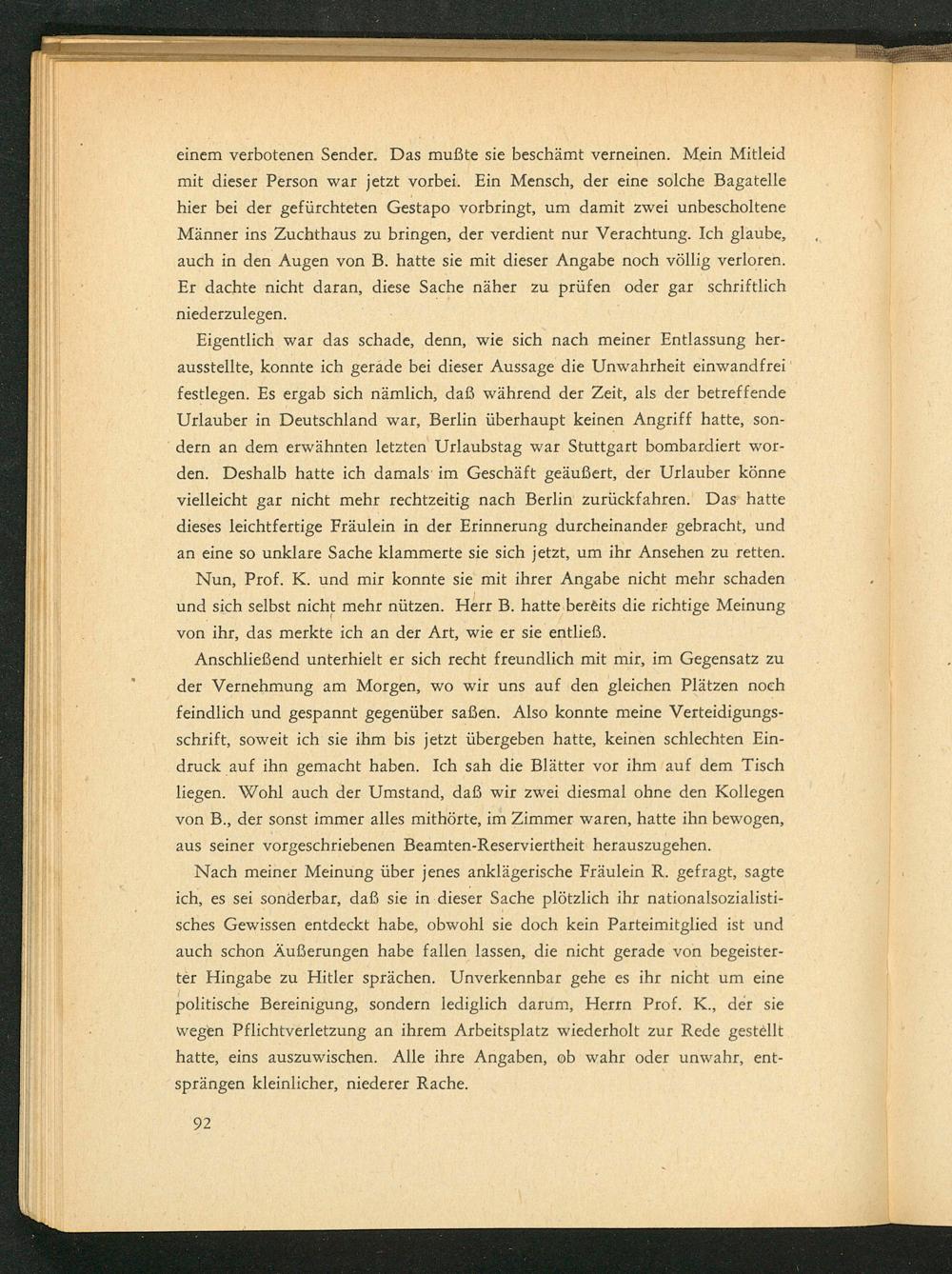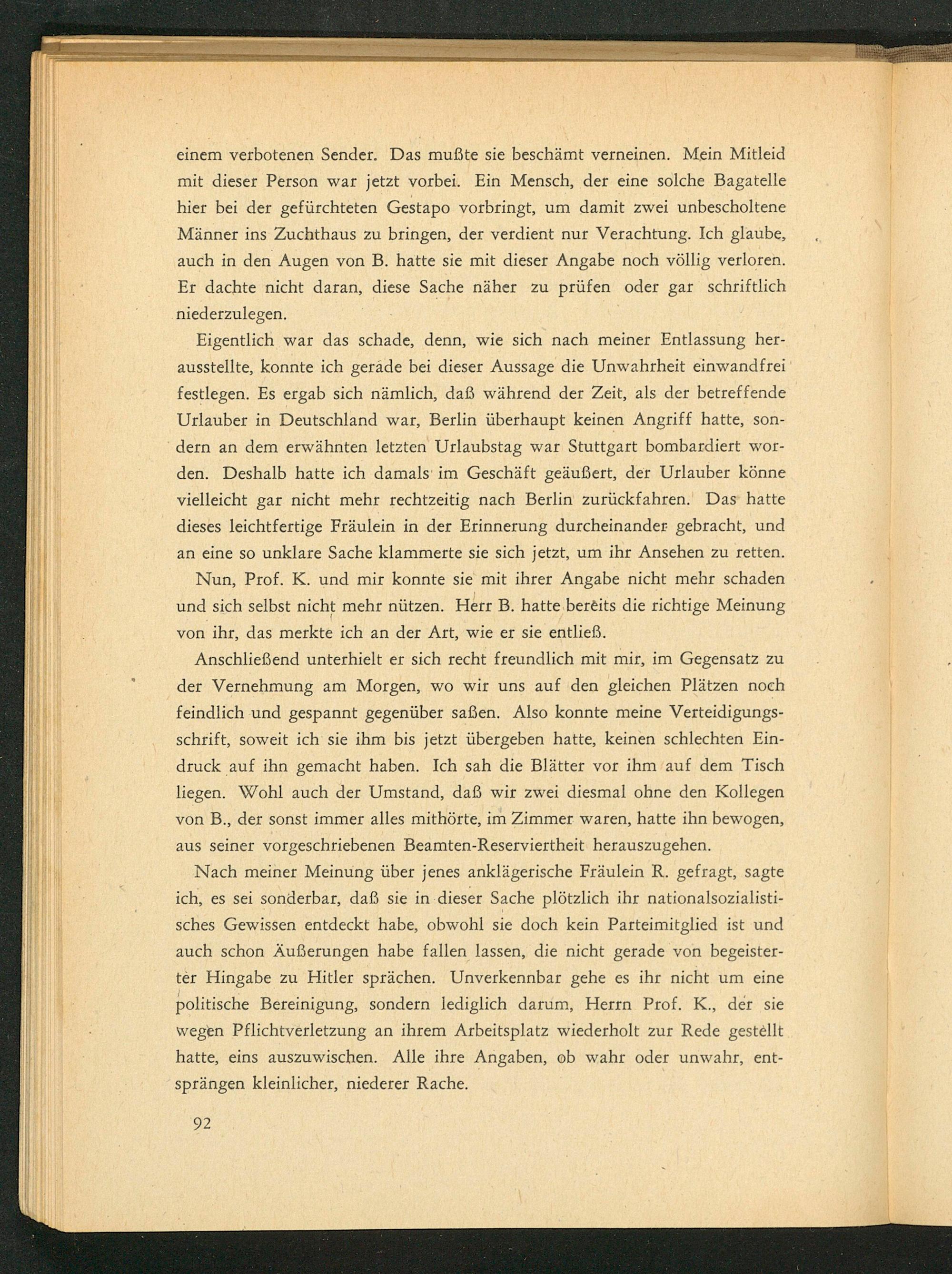 Eigentlich war das schade, denn, wie sich nach meiner Entlassung herausstellte, konnte ich gerade bei dieser Aussage die Unwahrheit einwandfrei festlegen. Es ergab sich nämlich, daß während der Zeit, als der betreffende Urlauber in Deutschland war, Berlin überhaupt keinen Angriff hatte, sondern an dem erwähnten letzten Urlaubstag war Stuttgart bombardiert worden. Deshalb hatte ich damals im Geschäft geäußert, der Urlauber könne vielleicht gar nicht mehr rechtzeitig nach Berlin zurückfahren. Das hatte dieses leichtfertige Fräulein in der Erinnerung durcheinander gebracht, und an eine so unklare Sache klammerte sie sich jetzt, um ihr Ansehen zu retten. Nun, Prof. K. und mir konnte sie mit ihrer Angabe nicht mehr schaden und sich selbst nicht mehr nützen. Herr B. hatte bereits die richtige Meinung von ihr, das merkte ich an der Art, wie er sie entließ.