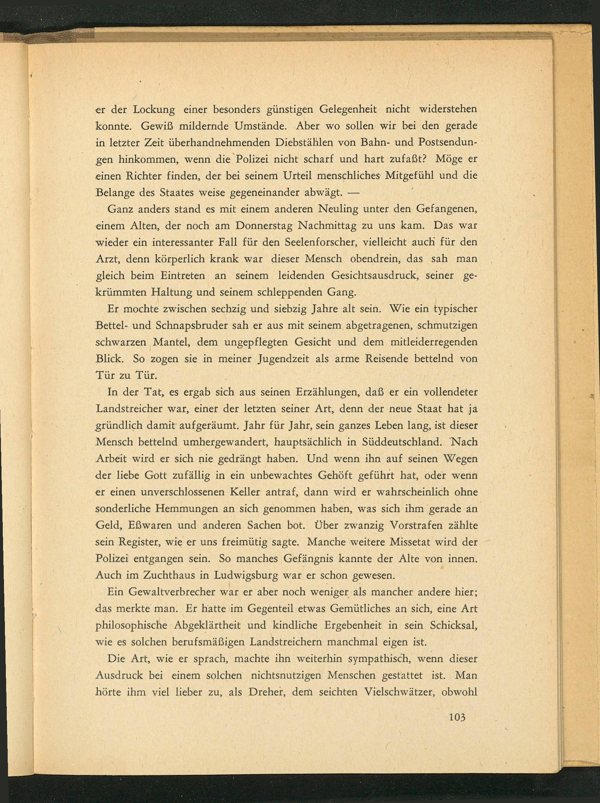 Ein Gewaltverbrecher war er aber noch weniger als mancher andere hier; das merkte man. Er hatte im Gegenteil etwas Gemütliches an sich, eine Art philosophische Abgeklärtheit und kindliche Ergebenheit in sein Schicksal, wie es solchen berufsmäßigen Landstreichern manchmal eigen ist.