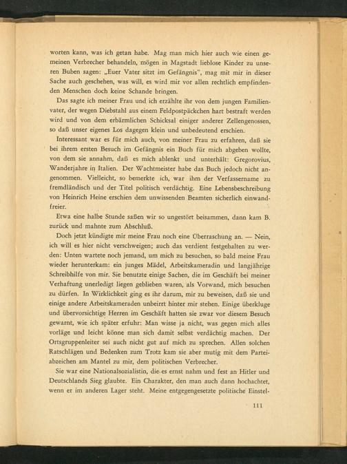 Interessant war es für mich auch, von meiner Frau zu erfahren, daß sie bei ihrem ersten Besuch im Gefängnis ein Buch für mich abgeben wollte, von dem sie annahm, daß es mich ablenkt und unterhält: Gregorovius , Wanderjahre in Italien. Der Wachtmeister habe das Buch jedoch nicht angenommen. Vielleicht, so bemerkte ich, war ihm der Verfassername zu fremdländisch und der Titel politisch verdächtig. Eine Lebensbeschreibung von Heinrich Heine erschien dem unwissenden Beamten sicherlich einwandfreier.