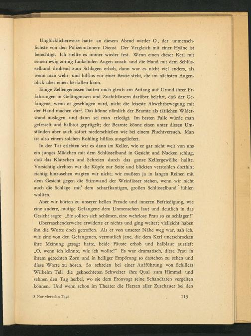 Aber wir hörten zu unserer hellen Freude und inneren Befriedigung, wie eine andere, mutige Gefangene dem Unmenschen laut und deutlich in das Gesicht sagte:„ Sie sollten sich schämen, eine wehrlose Frau so zu schlagen!"
