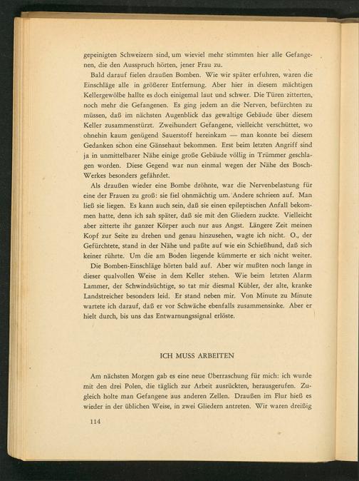 Als draußen wieder eine Bombe dröhnte, war die Nervenbelastung für eine der Frauen zu groß: sie fiel ohnmächtig um. Andere schrieen auf. Man ließ sie liegen. Es kann auch sein, daß sie einen epileptischen Anfall bekommen hatte, denn ich sah später, daß sie mit den Gliedern zuckte. Vielleicht aber zitterte ihr ganzer Körper auch nur aus Angst. Längere Zeit meinen Kopf zur Seite zu drehen und genau hinzusehen, wagte ich nicht. O., der Gefürchtete, stand in der Nähe und paẞte auf wie ein Schießhund, daß sich keiner rührte. Um die am Boden liegende kümmerte er sich nicht weiter. Die Bomben- Einschläge hörten bald auf. Aber wir mußten noch lange in dieser qualvollen Weise in dem Keller stehen. Wie beim letzten Alarm Lammer, der Schwindsüchtige, so tat mir diesmal Kübler, der alte, kranke Landstreicher besonders leid. Er stand neben mir. Von Minute zu Minute wartete ich darauf, daß er vor Schwäche ebenfalls zusammensinke. Aber er hielt durch, bis uns das Entwarnungssignal erlöste.