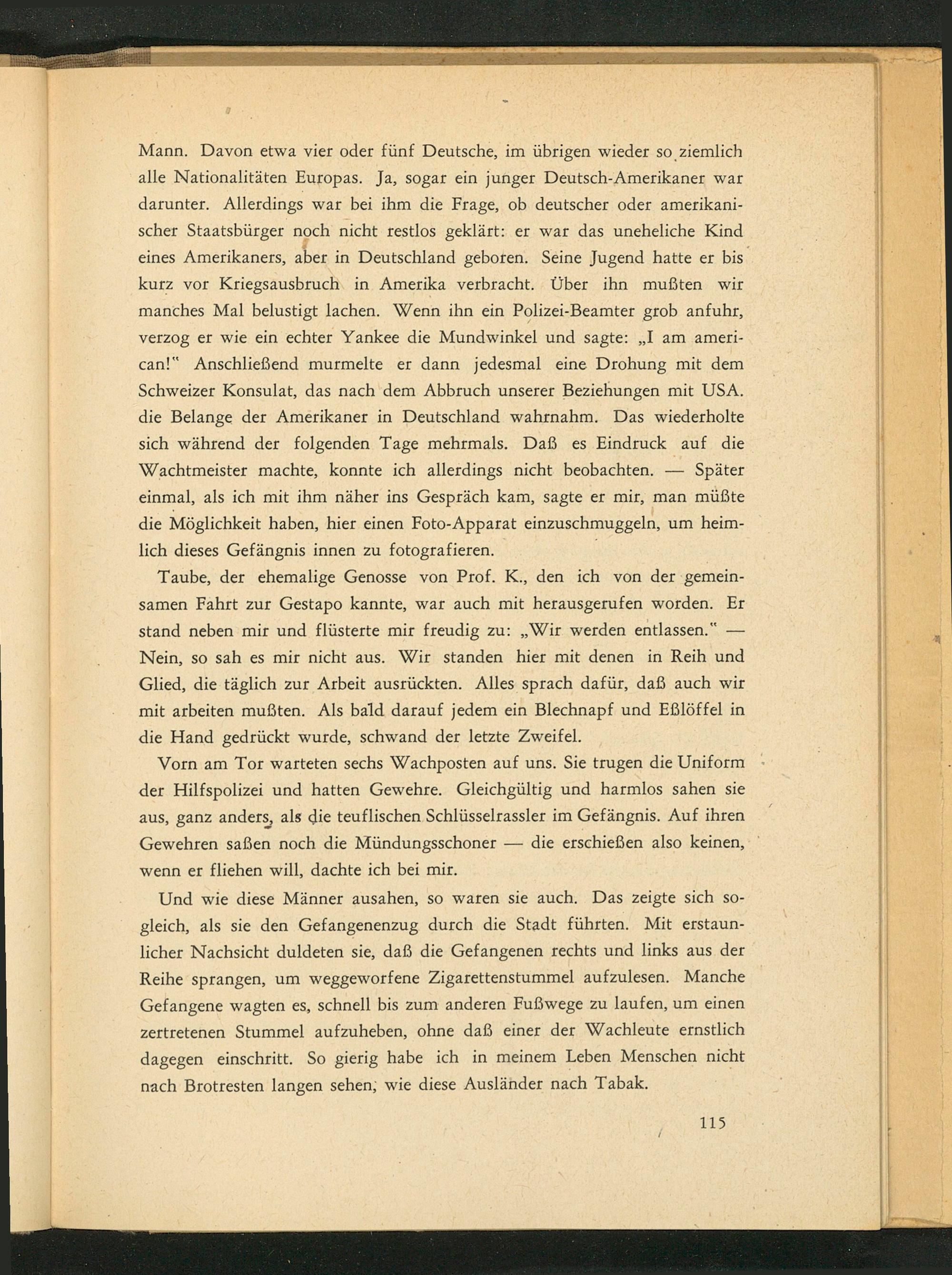 kurz vor Kriegsausbruch. in Amerika verbracht. Über ihn mußten wir manches Mal belustigt lachen. Wenn ihn ein Polizei-Beamter grob anfuhr, verzog er wie ein echter Yankee die Mundwinkel und sagte:„I am ameri- can!“ Anschließend murmelte er dann jedesmal eine Drohung mit dem Schweizer Konsulat, das nach dem Abbruch unserer Beziehungen mit USA . die Belange der Amerikaner in Deutschland wahrnahm. Das wiederholte sich während der folgenden Tage mehrmals. Daß es Eindruck auf die Wachtmeister machte, konnte ich allerdings nicht beobachten.— Später einmal, als ich mit ihm näher ins Gespräch kam, sagte er mir, man müßte die Möglichkeit haben, hier einen Foto-Apparat einzuschmuggeln, um heim- lich dieses Gefängnis innen zu fotografieren.