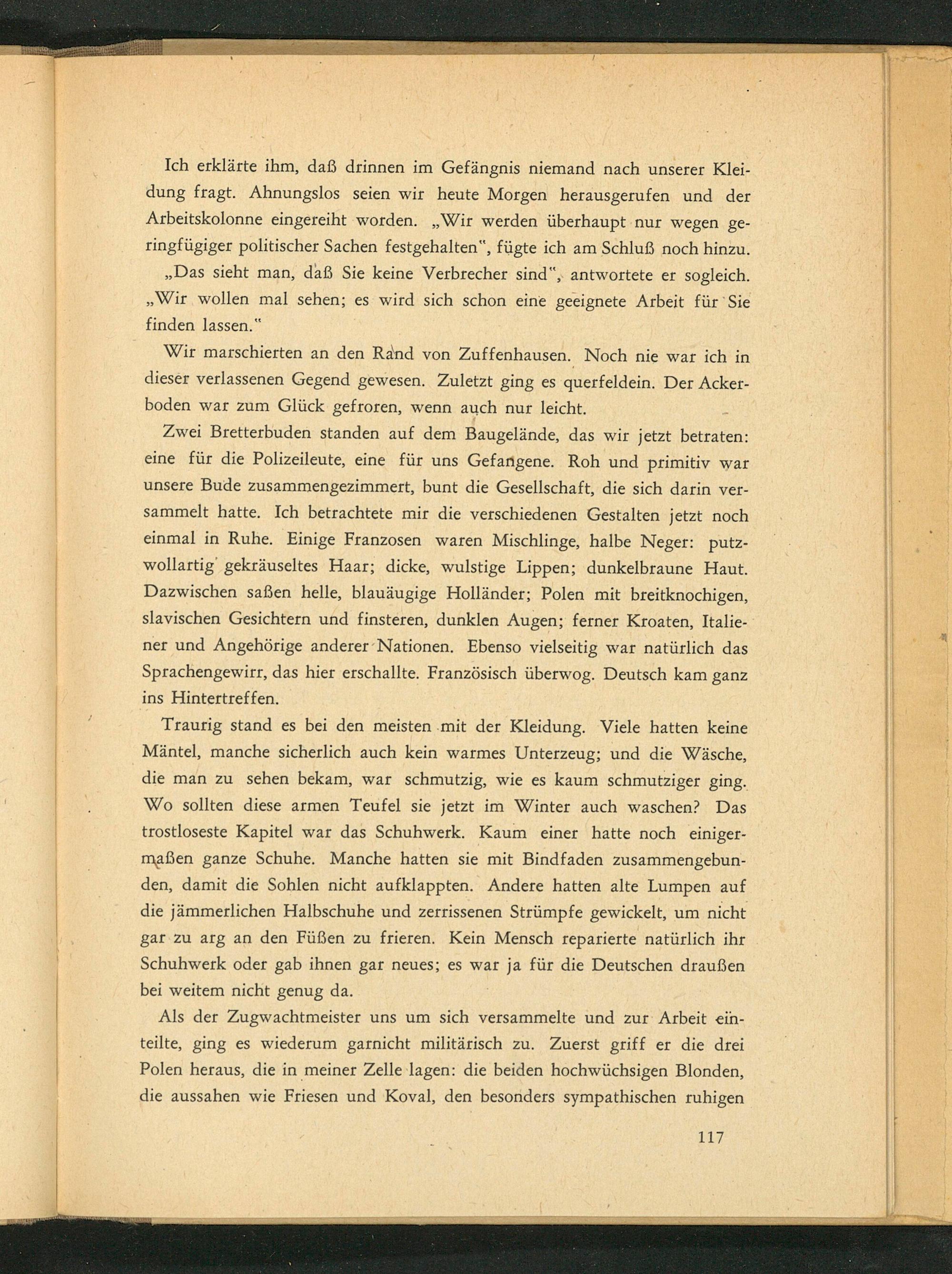Zwei Bretterbuden standen auf dem Baugelände, das wir jetzt betraten: eine für die Polizeileute, eine für uns Gefangene. Roh und primitiv war unsere Bude zusammengezimmert, bunt die Gesellschaft, die sich darin versammelt hatte. Ich betrachtete mir die verschiedenen Gestalten jetzt noch einmal in Ruhe. Einige Franzosen waren Mischlinge, halbe Neger: putzwollartig gekräuseltes Haar; dicke, wulstige Lippen; dunkelbraune Haut. Dazwischen saßen helle, blauäugige Holländer; Polen mit breitknochigen, slavischen Gesichtern und finsteren, dunklen Augen; ferner Kroaten , Italiener und Angehörige anderer Nationen. Ebenso vielseitig war natürlich das Sprachengewirr, das hier erschallte. Französisch überwog. Deutsch kam ganz ins Hintertreffen.