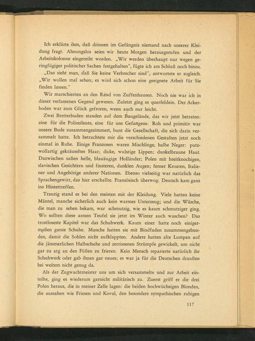 Traurig stand es bei den meisten mit der Kleidung. Viele hatten keine Mäntel, manche sicherlich auch kein warmes Unterzeug; und die Wäsche, die man zu sehen bekam, war schmutzig, wie es kaum schmutziger ging. Wo sollten diese armen Teufel sie jetzt im Winter auch waschen? Das trostloseste Kapitel war das Schuhwerk. Kaum einer hatte noch einigermaßen ganze Schuhe. Manche hatten sie mit Bindfaden zusammengebunden, damit die Sohlen nicht aufklappten. Andere hatten alte Lumpen auf die jämmerlichen Halbschuhe und zerrissenen Strümpfe gewickelt, um nicht gar zu arg an den Füßen zu frieren. Kein Mensch reparierte natürlich ihr Schuhwerk oder gab ihnen gar neues; es war ja für die Deutschen draußen bei weitem nicht genug da.