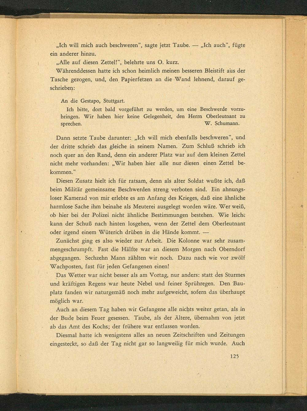 Diesen Zusatz hielt ich für ratsam, denn als alter Soldat wußte ich, daß beim Militär gemeinsame Beschwerden streng verboten sind. Ein ahnungs- loser Kamerad von mir erlebte es am Anfang des Krieges, daß eine ähnliche harmlose Sache ihm beinahe als Meuterei ausgelegt worden wäre. Wer weiß, ob hier bei der Polizei nicht ähnliche Bestimmungen bestehen. Wie leichi kann der Schuß nach hinten losgehen, wenn der Zettel dem Oberleutnant oder irgend einem Wüterich drüben in die Hände kommt.—