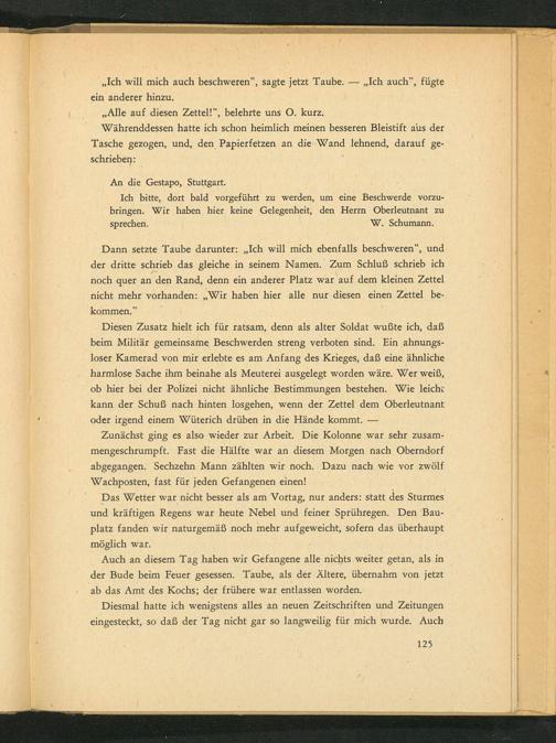 Dann setzte Taube darunter:„Ich will mich ebenfalls beschweren“, und der dritte schrieb das gleiche in seinem Namen. Zum Schluß schrieb ich noch quer an den Rand, denn ein anderer Platz war auf dem kleinen Zettel nicht mehr vorhanden:„Wir haben hier alle nur diesen einen Zettel be- kommen.“