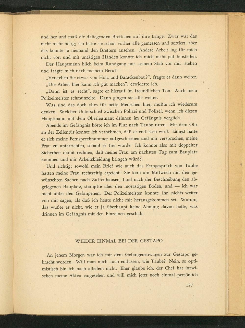 Abends im Gefängnis hörte ich im Flur nach Taube rufen. Mit dem Ohr an der Zellentür konnte ich vernehmen, daß er entlassen wird. Längst hatte er sich meine Fernsprechnummer aufgeschrieben und mir versprochen, meine Frau zu unterrichten, sobald er frei würde. Ich konnte also mit doppelter Sicherheit damit rechnen, daß meine Frau am nächsten Tag zum Bauplatz kommen und mir Arbeitskleidung bringen würde.