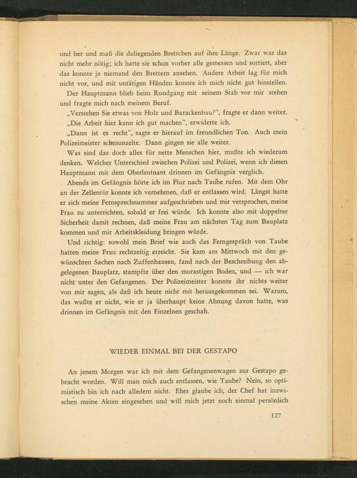 An jenem Morgen war ich mit dem Gefangenenwagen zur Gestapo ge- bracht worden. Will man mich auch entlassen, wie Taube? Nein, so opti- mistisch bin ich nach alledem nicht. Eher glaube ich, der Chef hat inzwi- schen meine Akten eingesehen und will mich jetzt noch einmal persönlich