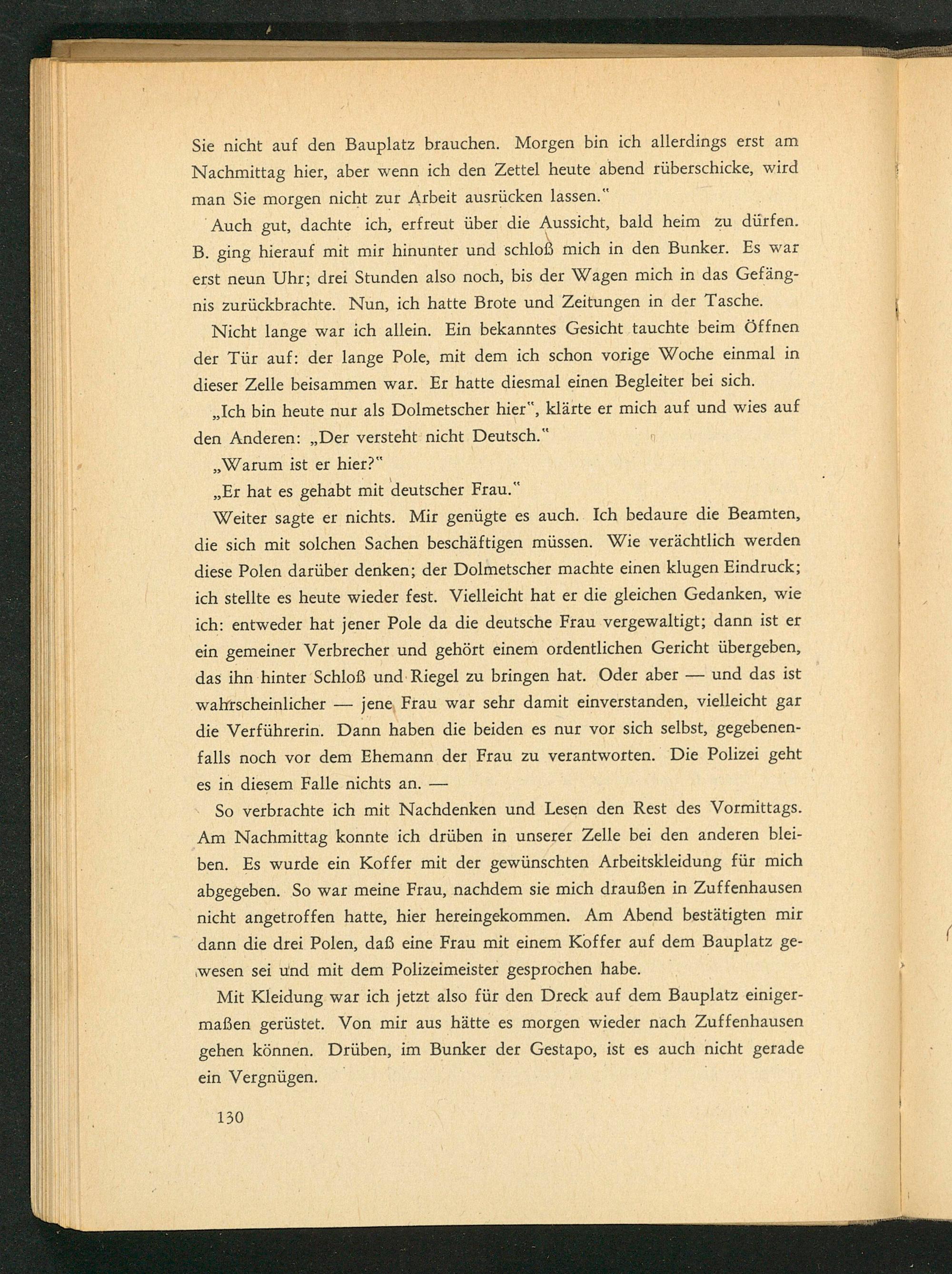 So verbrachte ich mit Nachdenken und Lesen den Rest des Vormittags. Am Nachmittag konnte ich drüben in unserer Zelle bei den anderen blei- ben. Es wurde ein Koffer mit der gewünschten Arbeitskleidung für mich abgegeben. So war meine Frau, nachdem sie mich draußen in Zuffenhausen nicht angetroffen hatte, hier hereingekommen. Am Abend bestätigten mir dann die drei Polen , daß eine Frau mit einem Koffer auf dem Bauplatz ge- ‚wesen sei und mit dem Polizeimeister gesprochen habe.