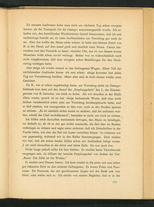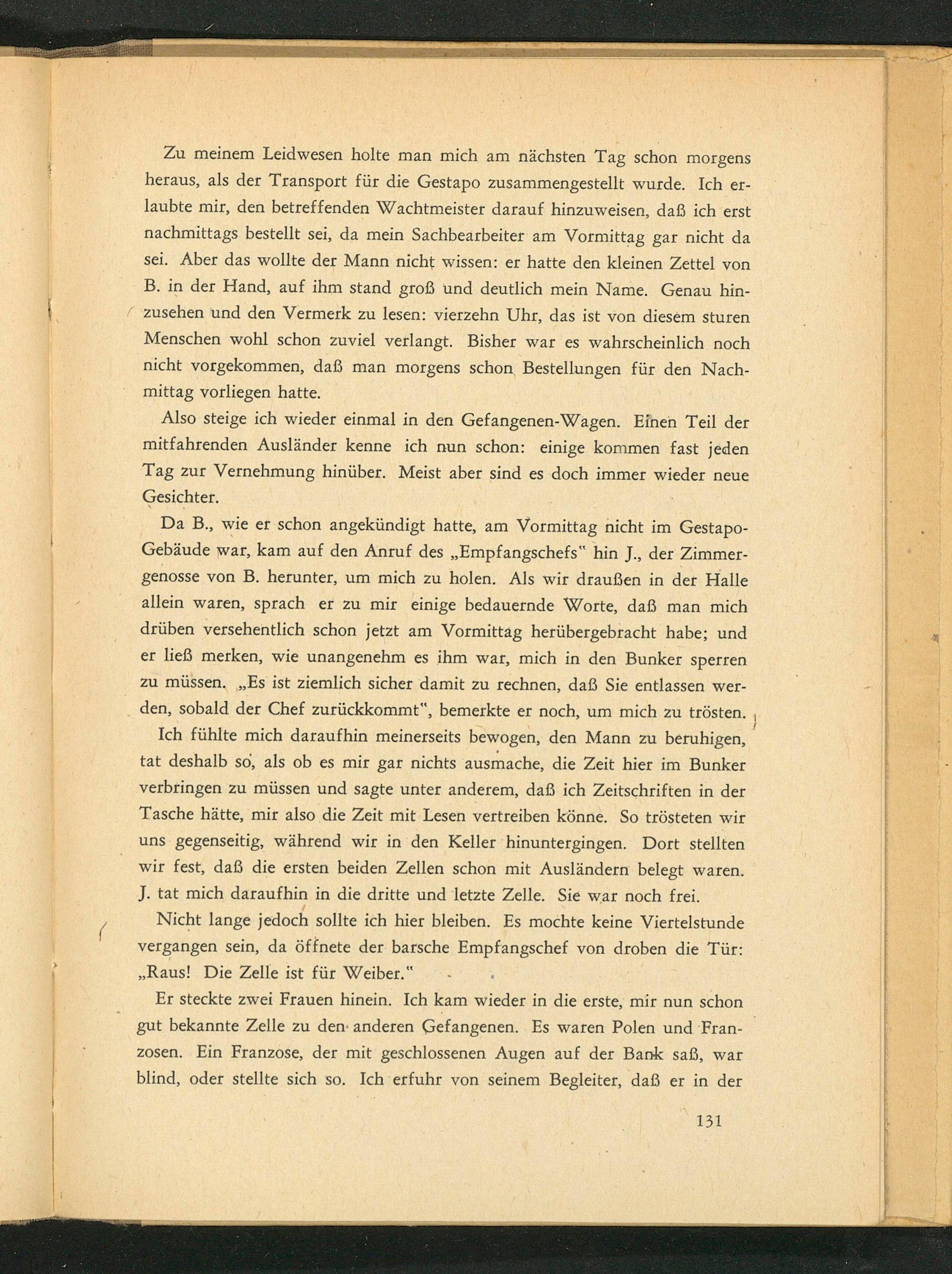 Zu meinem Leidwesen holte man mich am nächsten Tag schon morgens heraus, als der Transport für die Gestapo zusammengestellt wurde. Ich erlaubte mir, den betreffenden Wachtmeister darauf hinzuweisen, daß ich erst nachmittags bestellt sei, da mein Sachbearbeiter am Vormittag gar nicht da sei. Aber das wollte der Mann nicht wissen: er hatte den kleinen Zettel von B. in der Hand, auf ihm stand groß und deutlich mein Name. Genau hinzusehen und den Vermerk zu lesen: vierzehn Uhr, das ist von diesem sturen Menschen wohl schon zuviel verlangt. Bisher war es wahrscheinlich noch nicht vorgekommen, daß man morgens schon Bestellungen für den Nachmittag vorliegen hatte.