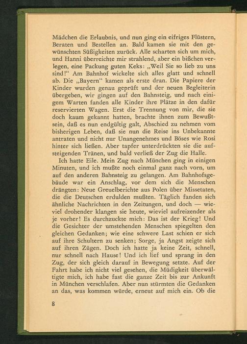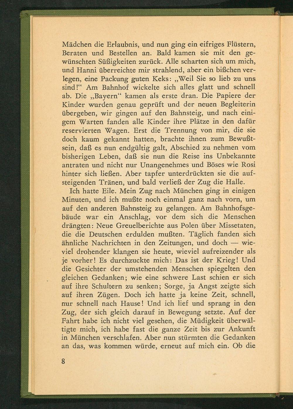 Ich hatte Eile. Mein Zug nach München ging in einigen Minuten, und ich mußte noch einmal ganz nach vorn, um auf den anderen Bahnsteig zu gelangen. Am Bahnhofsgebäude war ein Anschlag, vor dem sich die Menschen drängten: Neue Greuelberichte aus Polen über Missetaten, die die Deutschen erdulden mußten. Täglich fanden sich ähnliche Nachrichten in den Zeitungen, und doch- wieviel drohender klangen sie heute, wieviel aufreizender als je vorher! Es durchzuckte mich: Das ist der Krieg! Und die Gesichter der umstehenden Menschen spiegelten den gleichen Gedanken; wie eine schwere Last schien er sich auf ihre Schultern zu senken; Sorge, ja Angst zeigte sich auf ihren Zügen. Doch ich hatte ja keine Zeit, schnell, nur schnell nach Hause! Und ich lief und sprang in den Zug, der sich gleich darauf in Bewegung setzte. Auf der Fahrt habe ich nicht viel gesehen, die Müdigkeit überwältigte mich, ich habe fast die ganze Zeit bis zur Ankunft in München verschlafen. Aber nun stürmten die Gedanken an das, was kommen würde, erneut auf mich ein. Ob die