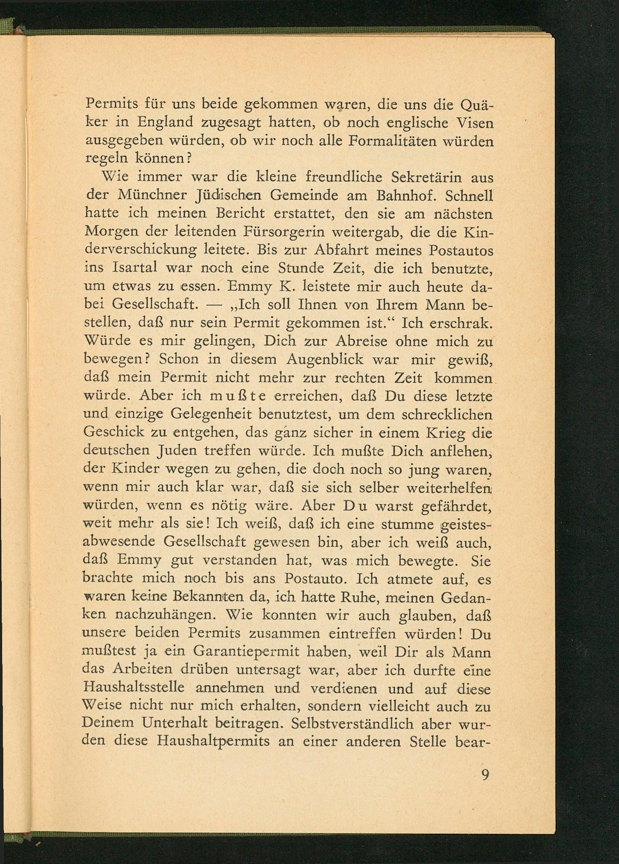 Wie immer war die kleine freundliche Sekretärin aus der Münchner Jüdischen Gemeinde am Bahnhof. Schnell hatte ich meinen Bericht erstattet, den sie am nächsten Morgen der leitenden Fürsorgerin weitergab, die die Kinderverschickung leitete. Bis zur Abfahrt meines Postautos ins Isartal war noch eine Stunde Zeit, die ich benutzte, um etwas zu essen. Emmy K. leistete mir auch heute dabei Gesellschaft.- ,, Ich soll Ihnen von Ihrem Mann bestellen, daß nur sein Permit gekommen ist." Ich erschrak. Würde es mir gelingen, Dich zur Abreise ohne mich zu bewegen? Schon in diesem Augenblick war mir gewiß, daß mein Permit nicht mehr zur rechten Zeit kommen. würde. Aber ich mußte erreichen, daß Du diese letzte und einzige Gelegenheit benutztest, um dem schrecklichen Geschick zu entgehen, das ganz sicher in einem Krieg die deutschen Juden treffen würde. Ich mußte Dich anflehen, der Kinder wegen zu gehen, die doch noch so jung waren, wenn mir auch klar war, daß sie sich selber weiterhelfen würden, wenn es nötig wäre. Aber Du warst gefährdet, weit mehr als sie! Ich weiß, daß ich eine stumme geistesabwesende Gesellschaft gewesen bin, aber ich weiß auch, daß Emmy gut verstanden hat, was mich bewegte. Sie brachte mich noch bis ans Postauto. Ich atmete auf, es waren keine Bekannten da, ich hatte Ruhe, meinen Gedanken nachzuhängen. Wie konnten wir auch glauben, daß unsere beiden Permits zusammen eintreffen würden! Du mußtest ja ein Garantiepermit haben, weil Dir als Mann das Arbeiten drüben untersagt war, aber ich durfte eine Haushaltsstelle annehmen und verdienen und auf diese Weise nicht nur mich erhalten, sondern vielleicht auch zu Deinem Unterhalt beitragen. Selbstverständlich aber wurden diese Haushaltpermits an einer anderen Stelle bear