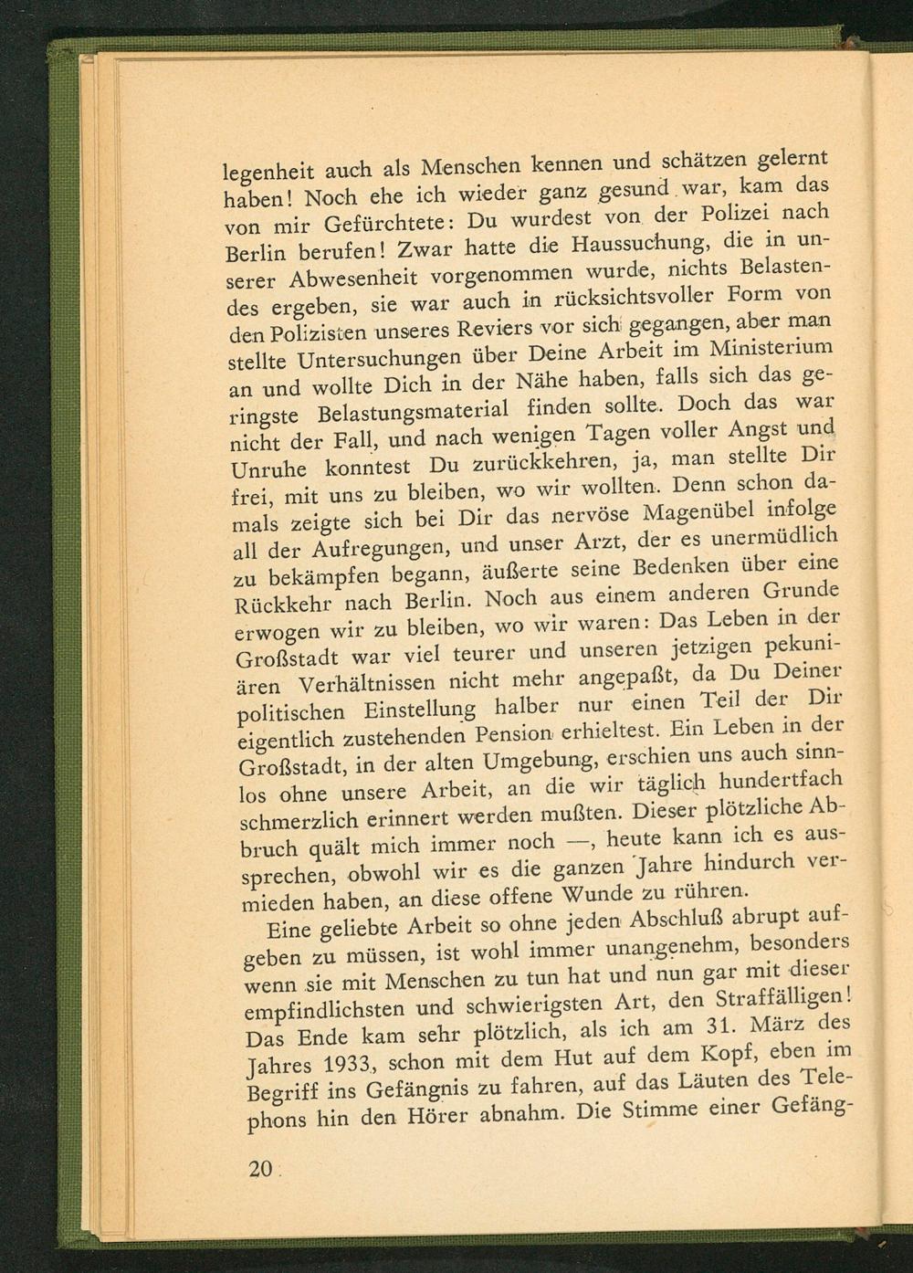 legenheit auch als Menschen kennen und schätzen gelernt haben! Noch ehe ich wieder ganz gesund war, kam das von mir Gefürchtete: Du wurdest von der Polizei nach Berlin berufen! Zwar hatte die Haussuchung, die in unserer Abwesenheit vorgenommen wurde, nichts Belastendes ergeben, sie war auch in rücksichtsvoller Form von den Polizisten unseres Reviers vor sich gegangen, aber man stellte Untersuchungen über Deine Arbeit im Ministerium an und wollte Dich in der Nähe haben, falls sich das geringste Belastungsmaterial finden sollte. Doch das war nicht der Fall, und nach wenigen Tagen voller Angst und Unruhe konntest Du zurückkehren, ja, man stellte Dir frei, mit uns zu bleiben, wo wir wollten. Denn schon damals zeigte sich bei Dir das nervöse Magenübel infolge all der Aufregungen, und unser Arzt, der es unermüdlich zu bekämpfen begann, äußerte seine Bedenken über eine Rückkehr nach Berlin . Noch aus einem anderen Grunde erwogen wir zu bleiben, wo wir waren: Das Leben in der Großstadt war viel teurer und unseren jetzigen pekuniären Verhältnissen nicht mehr angepaßt, da Du Deiner politischen Einstellung halber nur einen Teil der Dir eigentlich zustehenden Pension erhieltest. Ein Leben in der Großstadt, in der alten Umgebung, erschien uns auch sinnlos ohne unsere Arbeit, an die wir täglich hundertfach schmerzlich erinnert werden mußten. Dieser plötzliche Abbruch quält mich immer noch-, heute kann ich es aussprechen, obwohl wir es die ganzen Jahre hindurch vermieden haben, an diese offene Wunde zu rühren.