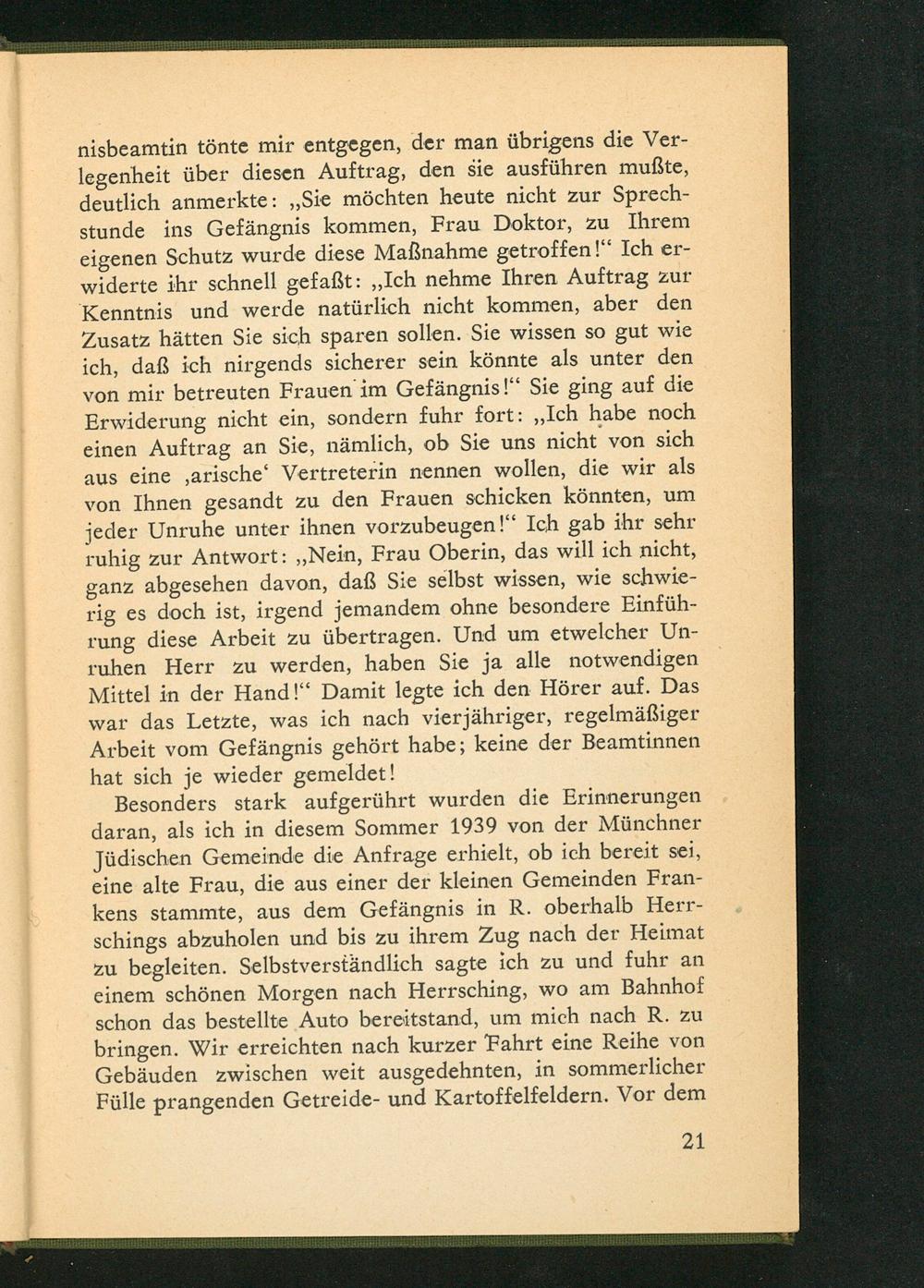 Besonders stark aufgerührt wurden die Erinnerungen daran, als ich in diesem Sommer 1939 von der Münchner Jüdischen Gemeinde die Anfrage erhielt, ob ich bereit sei, eine alte Frau, die aus einer der kleinen Gemeinden Frankens stammte, aus dem Gefängnis in R. oberhalb Herrschings abzuholen und bis zu ihrem Zug nach der Heimat zu begleiten. Selbstverständlich sagte ich zu und fuhr an einem schönen Morgen nach Herrsching , wo am Bahnhof schon das bestellte Auto bereitstand, um mich nach R. zu bringen. Wir erreichten nach kurzer Fahrt eine Reihe von Gebäuden zwischen weit ausgedehnten, in sommerlicher Fülle prangenden Getreide- und Kartoffelfeldern. Vor dem