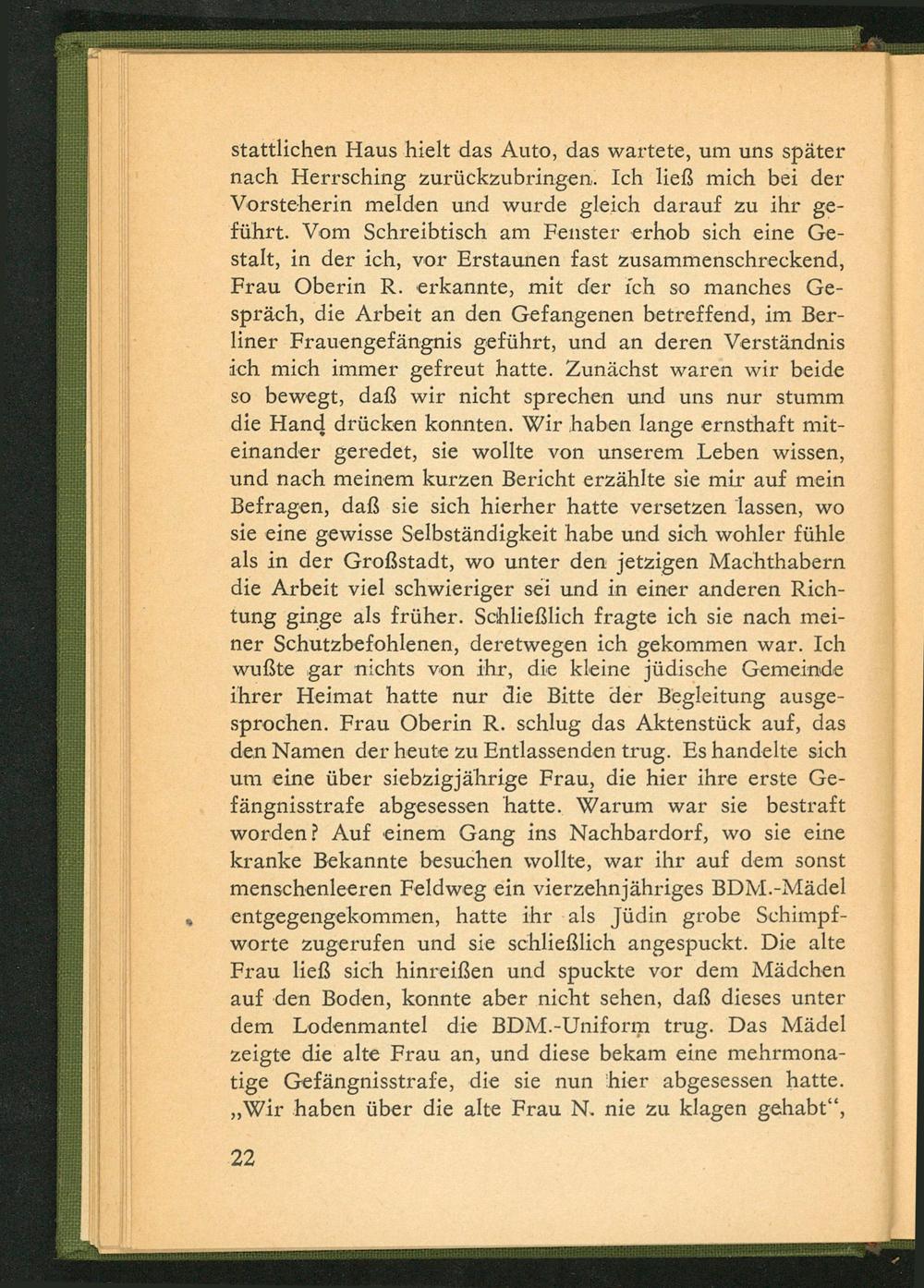 stattlichen Haus hielt das Auto, das wartete, um uns später nach Herrsching zurückzubringen. Ich ließ mich bei der Vorsteherin melden und wurde gleich darauf zu ihr geführt. Vom Schreibtisch am Fenster erhob sich eine Gestalt, in der ich, vor Erstaunen fast zusammenschreckend, Frau Oberin R. erkannte, mit der ich so manches Gespräch, die Arbeit an den Gefangenen betreffend, im Berliner Frauengefängnis geführt, und an deren Verständnis ich mich immer gefreut hatte. Zunächst waren wir beide so bewegt, daß wir nicht sprechen und uns nur stumm die Hand drücken konnten. Wir haben lange ernsthaft miteinander geredet, sie wollte von unserem Leben wissen, und nach meinem kurzen Bericht erzählte sie mir auf mein Befragen, daß sie sich hierher hatte versetzen lassen, wo sie eine gewisse Selbständigkeit habe und sich wohler fühle als in der Großstadt, wo unter den jetzigen Machthabern die Arbeit viel schwieriger sei und in einer anderen Richtung ginge als früher. Schließlich fragte ich sie nach meiner Schutzbefohlenen, deretwegen ich gekommen war. Ich wußte gar nichts von ihr, die kleine jüdische Gemeinde ihrer Heimat hatte nur die Bitte der Begleitung ausgesprochen. Frau Oberin R. schlug das Aktenstück auf, das den Namen der heute zu Entlassenden trug. Es handelte sich um eine über siebzigjährige Frau, die hier ihre erste Gefängnisstrafe abgesessen hatte. Warum war sie bestraft worden? Auf einem Gang ins Nachbardorf, wo sie eine kranke Bekannte besuchen wollte, war ihr auf dem sonst menschenleeren Feldweg ein vierzehnjähriges BDM.- Mädel entgegengekommen, hatte ihr als Jüdin grobe Schimpfworte zugerufen und sie schließlich angespuckt. Die alte Frau ließ sich hinreißen und spuckte vor dem Mädchen auf den Boden, konnte aber nicht sehen, daß dieses unter dem Lodenmantel die BDM. - Uniform trug. Das Mädel zeigte die alte Frau an, und diese bekam eine mehrmonatige Gefängnisstrafe, die sie nun hier abgesessen hatte. ,, Wir haben über die alte Frau N. nie zu klagen gehabt",