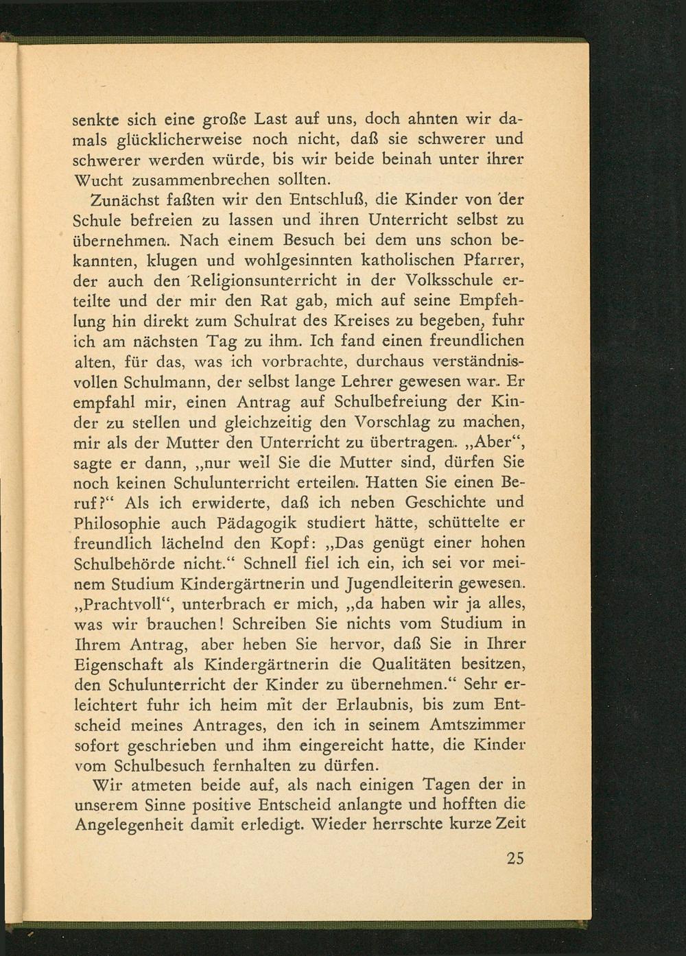 Zunächst faßten wir den Entschluß, die Kinder von der Schule befreien zu lassen und ihren Unterricht selbst zu übernehmen. Nach einem Besuch bei dem uns schon bekannten, klugen und wohlgesinnten katholischen Pfarrer, der auch den' Religionsunterricht in der Volksschule erteilte und der mir den Rat gab, mich auf seine Empfehlung hin direkt zum Schulrat des Kreises zu begeben, fuhr ich am nächsten Tag zu ihm. Ich fand einen freundlichen alten, für das, was ich vorbrachte, durchaus verständnisvollen Schulmann, der selbst lange Lehrer gewesen war. Er empfahl mir, einen Antrag auf Schulbefreiung der Kinder zu stellen und gleichzeitig den Vorschlag zu machen, mir als der Mutter den Unterricht zu übertragen. ,, Aber", sagte er dann ,,, nur weil Sie die Mutter sind, dürfen Sie noch keinen Schulunterricht erteilen. Hatten Sie einen Beruf?" Als ich erwiderte, daß ich neben Geschichte und Philosophie auch Pädagogik studiert hätte, schüttelte er freundlich lächelnd den Kopf: ,, Das genügt einer hohen Schulbehörde nicht." Schnell fiel ich ein, ich sei vor meinem Studium Kindergärtnerin und Jugendleiterin gewesen. ,, Prachtvoll", unterbrach er mich ,,, da haben wir ja alles, was wir brauchen! Schreiben Sie nichts vom Studium in Ihrem Antrag, aber heben Sie hervor, daß Sie in Ihrer Eigenschaft als Kindergärtnerin die Qualitäten besitzen, den Schulunterricht der Kinder zu übernehmen." Sehr erleichtert fuhr ich heim mit der Erlaubnis, bis zum Entscheid meines Antrages, den ich in seinem Amtszimmer sofort geschrieben und ihm eingereicht hatte, die Kinder vom Schulbesuch fernhalten zu dürfen.