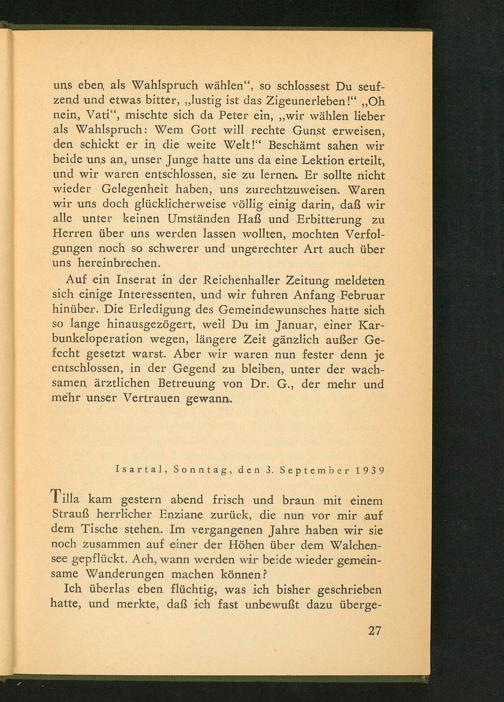 uns eben als Wahlspruch wählen", so schlossest Du seufzend und etwas bitter ,,, lustig ist das Zigeunerleben!" ,, Oh nein, Vati", mischte sich da Peter ein ,,, wir wählen lieber als Wahlspruch: Wem Gott will rechte Gunst erweisen, den schickt er in die weite Welt!" Beschämt sahen wir beide uns an, unser Junge hatte uns da eine Lektion erteilt, und wir waren entschlossen, sie zu lernen. Er sollte nicht wieder Gelegenheit haben, uns zurechtzuweisen. Waren wir uns doch glücklicherweise völlig einig darin, daß wir alle unter keinen Umständen Haß und Erbitterung zu Herren über uns werden lassen wollten, mochten Verfolgungen noch so schwerer und ungerechter Art auch über uns hereinbrechen.
