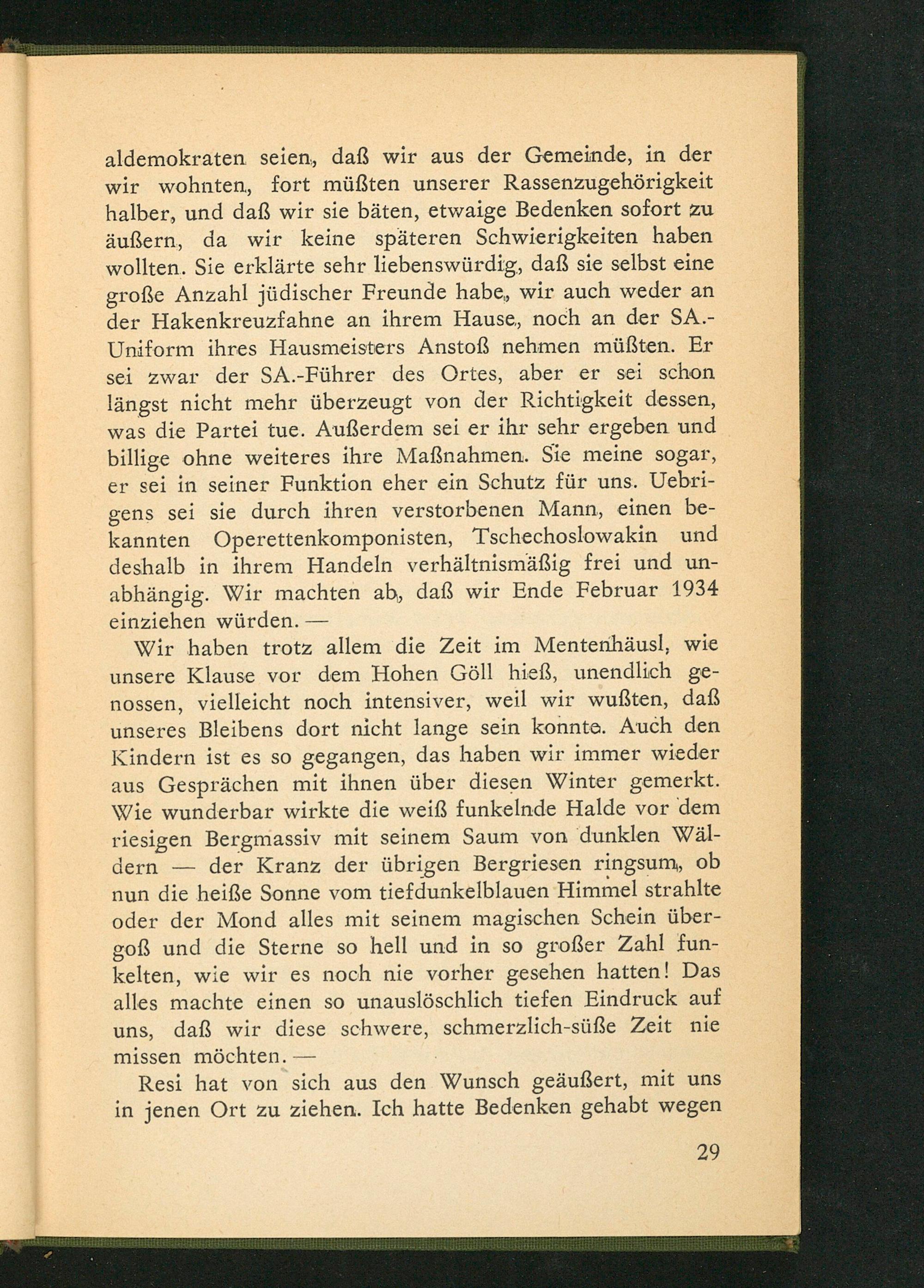 aldemokraten seien, daß wir aus der Gemeinde, in der wir wohnten, fort müßten unserer Rassenzugehörigkeit halber, und daß wir sie bäten, etwaige Bedenken sofort zu äußern, da wir keine späteren Schwierigkeiten haben wollten. Sie erklärte sehr liebenswürdig, daß sie selbst eine große Anzahl jüdischer Freunde habe, wir auch weder an der Hakenkreuzfahne an ihrem Hause, noch an der SA.Uniform ihres Hausmeisters Anstoß nehmen müßten. Er sei zwar der SA.- Führer des Ortes, aber er sei schon längst nicht mehr überzeugt von der Richtigkeit dessen, was die Partei tue. Außerdem sei er ihr sehr ergeben und billige ohne weiteres ihre Maßnahmen. Sie meine sogar, er sei in seiner Funktion eher ein Schutz für uns. Uebrigens sei sie durch ihren verstorbenen Mann, einen bekannten Operettenkomponisten, Tschechoslowakin und deshalb in ihrem Handeln verhältnismäßig frei und unabhängig. Wir machten ab, daß wir Ende Februar 1934 einziehen würden.