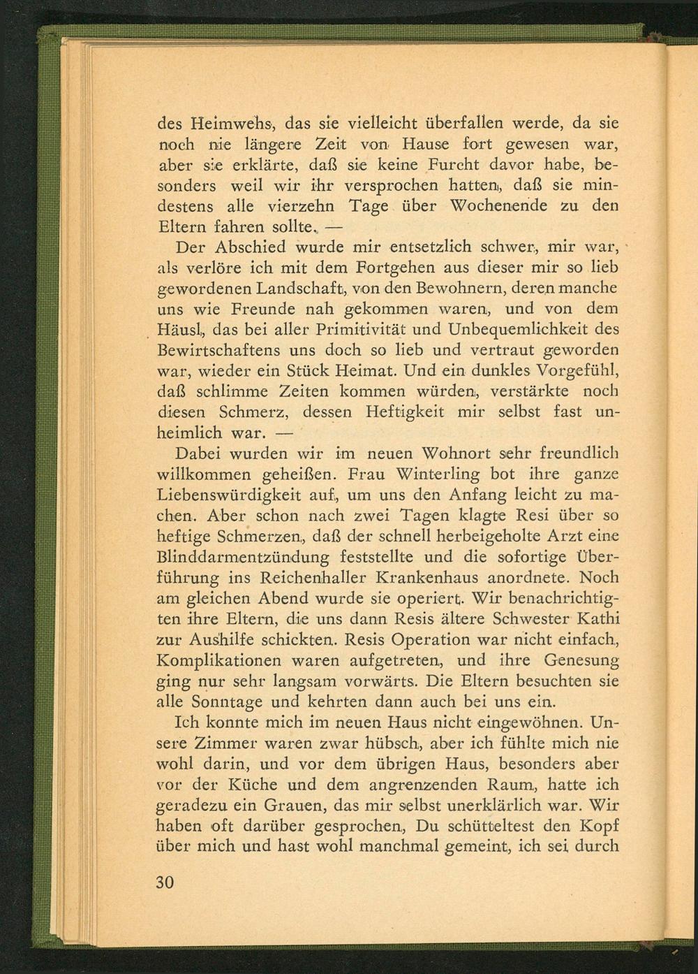 Dabei wurden wir im neuen Wohnort sehr freundlich willkommen geheißen. Frau Winterling bot ihre ganze Liebenswürdigkeit auf, um uns den Anfang leicht zu machen. Aber schon nach zwei Tagen klagte Resi über so heftige Schmerzen, daß der schnell herbeigeholte Arzt eine Blinddarmentzündung feststellte und die sofortige Überführung ins Reichenhaller Krankenhaus anordnete. Noch am gleichen Abend wurde sie operiert. Wir benachrichtigten ihre Eltern, die uns dann Resis ältere Schwester Kathi zur Aushilfe schickten. Resis Operation war nicht einfach, Komplikationen waren aufgetreten, und ihre Genesung ging nur sehr langsam vorwärts. Die Eltern besuchten sie alle Sonntage und kehrten dann auch bei uns ein.