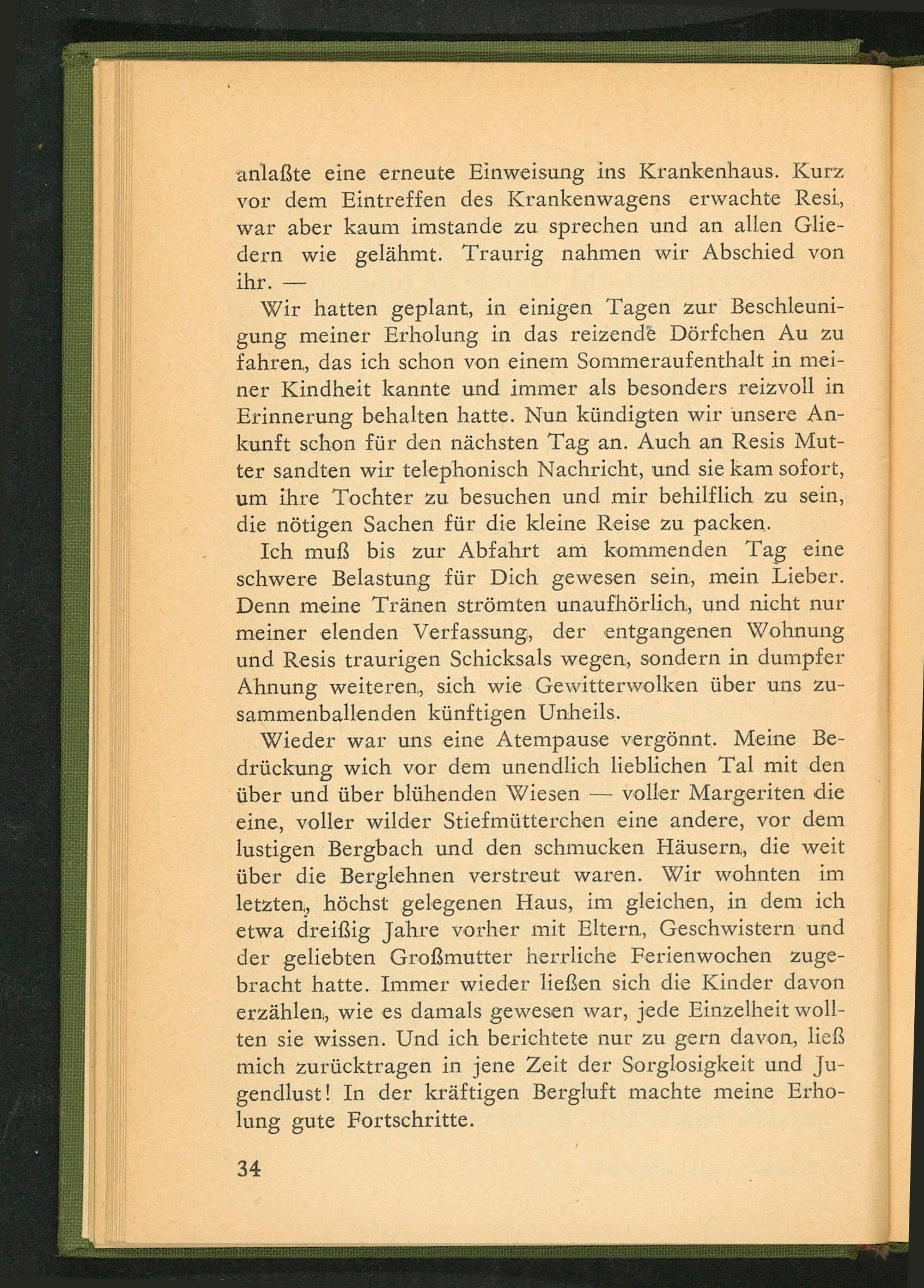 Wir hatten geplant, in einigen Tagen zur Beschleunigung meiner Erholung in das reizende Dörfchen Au zu fahren, das ich schon von einem Sommeraufenthalt in meiner Kindheit kannte und immer als besonders reizvoll in Erinnerung behalten hatte. Nun kündigten wir unsere Ankunft schon für den nächsten Tag an. Auch an Resis Mutter sandten wir telephonisch Nachricht, und sie kam sofort, um ihre Tochter zu besuchen und mir behilflich zu sein, die nötigen Sachen für die kleine Reise zu packen.