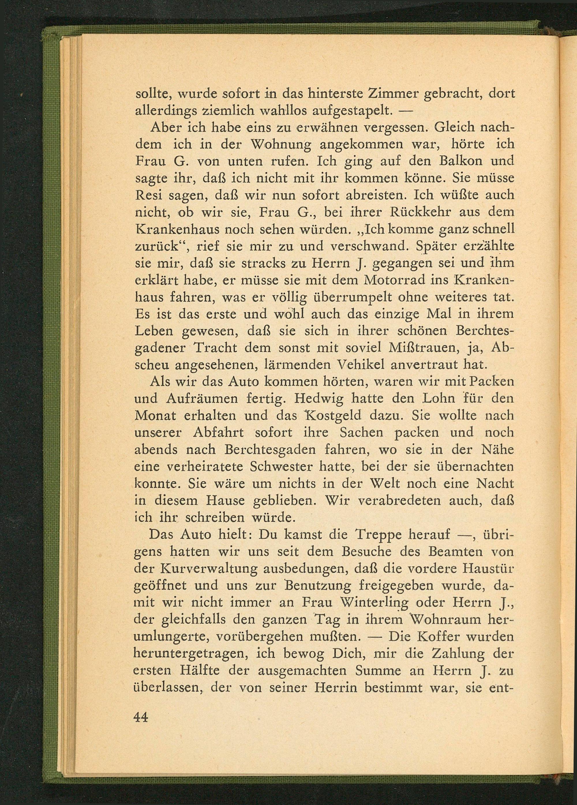 Aber ich habe eins zu erwähnen vergessen. Gleich nachdem ich in der Wohnung angekommen war, hörte ich Frau G. von unten rufen. Ich ging auf den Balkon und sagte ihr, daß ich nicht mit ihr kommen könne. Sie müsse Resi sagen, daß wir nun sofort abreisten. Ich wüßte auch nicht, ob wir sie, Frau G., bei ihrer Rückkehr aus dem Krankenhaus noch sehen würden. ,, Ich komme ganz schnell zurück", rief sie mir zu und verschwand. Später erzählte sie mir, daß sie stracks zu Herrn J. gegangen sei und ihm erklärt habe, er müsse sie mit dem Motorrad ins Krankenhaus fahren, was er völlig überrumpelt ohne weiteres tat. Es ist das erste und wohl auch das einzige Mal in ihrem Leben gewesen, daß sie sich in ihrer schönen Berchtesgadener Tracht dem sonst mit soviel Mißtrauen, ja, Abscheu angesehenen, lärmenden Vehikel anvertraut hat.