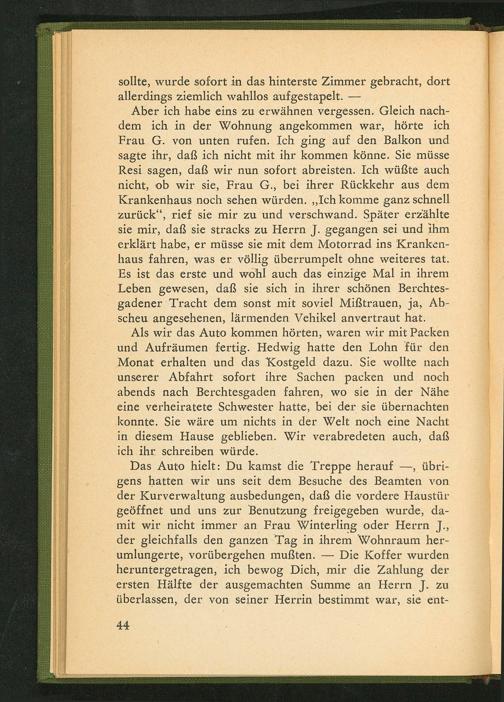 Als wir das Auto kommen hörten, waren wir mit Packen und Aufräumen fertig. Hedwig hatte den Lohn für den Monat erhalten und das Kostgeld dazu. Sie wollte nach unserer Abfahrt sofort ihre Sachen packen und noch abends nach Berchtesgaden fahren, wo sie in der Nähe eine verheiratete Schwester hatte, bei der sie übernachten konnte. Sie wäre um nichts in der Welt noch eine Nacht in diesem Hause geblieben. Wir verabredeten auch, daß ich ihr schreiben würde.