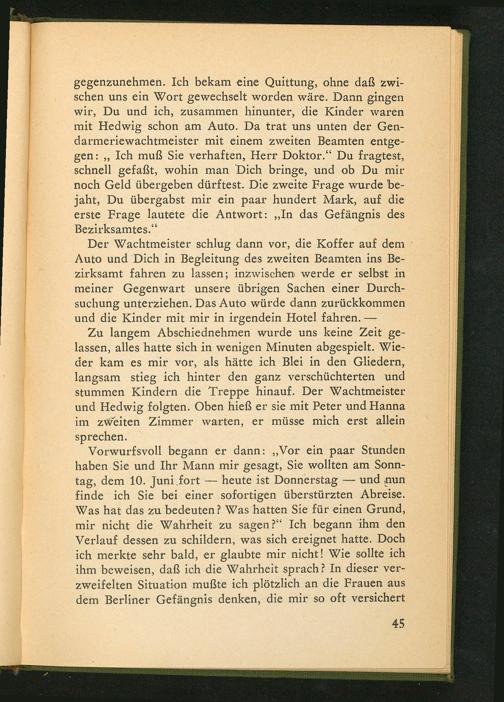 Vorwurfsvoll begann er dann: ,, Vor ein paar Stunden haben Sie und Ihr Mann mir gesagt, Sie wollten am Sonntag, dem 10. Juni fort- heute ist Donnerstag und nun finde ich Sie bei einer sofortigen überstürzten Abreise. Was hat das zu bedeuten? Was hatten Sie für einen Grund, mir nicht die Wahrheit zu sagen?" Ich begann ihm den Verlauf dessen zu schildern, was sich ereignet hatte. Doch ich merkte sehr bald, er glaubte mir nicht! Wie sollte ich ihm beweisen, daß ich die Wahrheit sprach? In dieser verzweifelten Situation mußte ich plötzlich an die Frauen aus dem Berliner Gefängnis denken, die mir so oft versichert