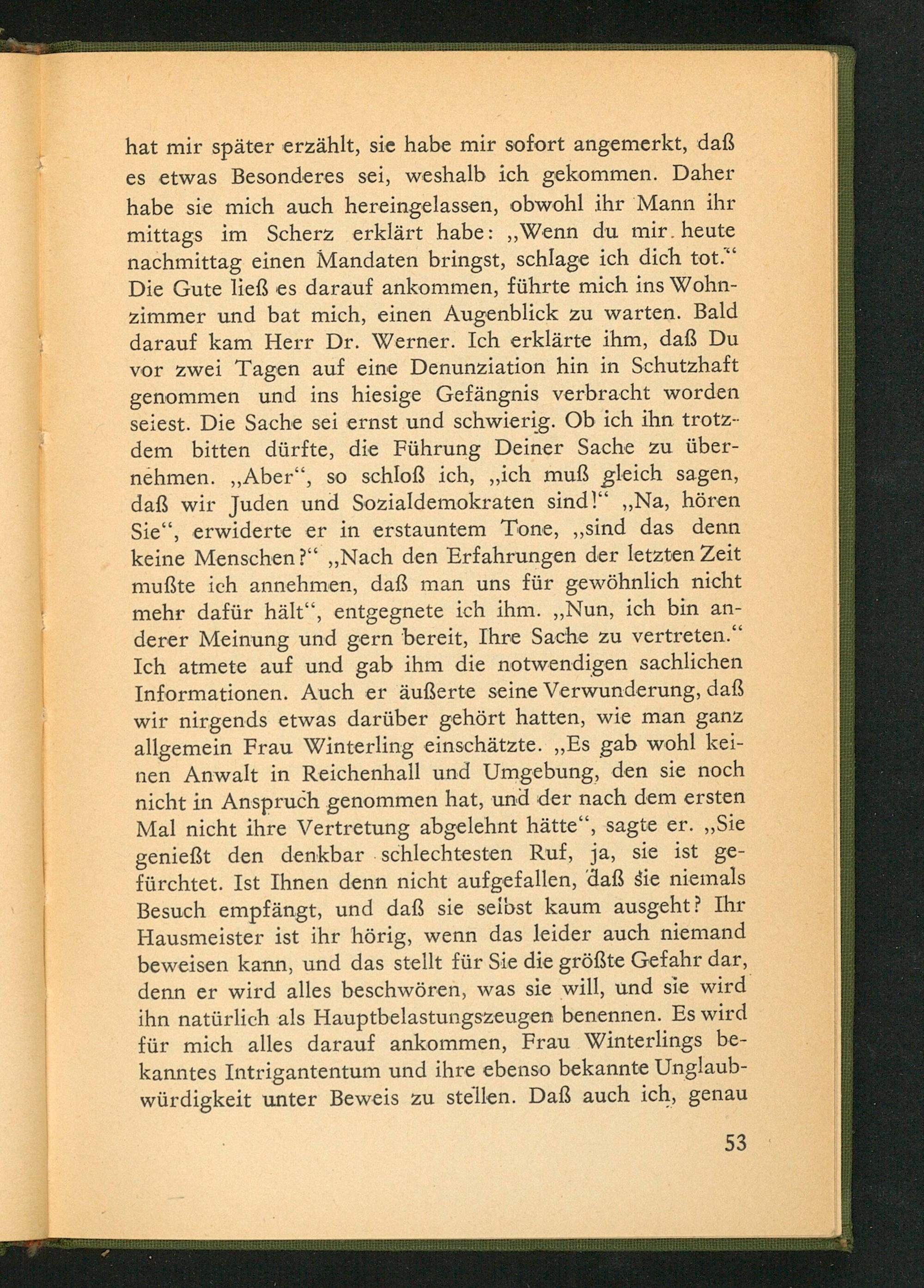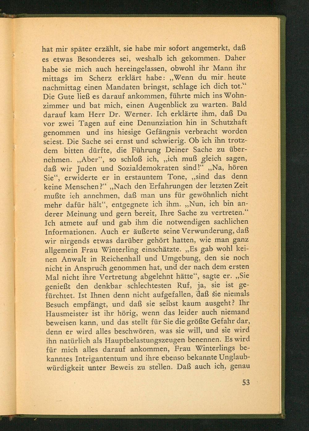 hat mir später erzählt, sie habe mir sofort angemerkt, daß es etwas Besonderes sei, weshalb ich gekommen. Daher habe sie mich auch hereingelassen, obwohl ihr Mann ihr mittags im Scherz erklärt habe: ,, Wenn du mir. heute nachmittag einen Mandaten bringst, schlage ich dich tot." Die Gute ließ es darauf ankommen, führte mich ins Wohnzimmer und bat mich, einen Augenblick zu warten. Bald darauf kam Herr Dr. Werner. Ich erklärte ihm, daß Du vor zwei Tagen auf eine Denunziation hin in Schutzhaft genommen und ins hiesige Gefängnis verbracht worden seiest. Die Sache sei ernst und schwierig. Ob ich ihn trotzdem bitten dürfte, die Führung Deiner Sache zu übernehmen. ,, Aber", so schloß ich, ,, ich muß gleich sagen, daß wir Juden und Sozialdemokraten sind!" ,, Na, hören Sie", erwiderte er in erstauntem Tone ,,, sind das denn keine Menschen?" ,, Nach den Erfahrungen der letzten Zeit mußte ich annehmen, daß man uns für gewöhnlich nicht mehr dafür hält", entgegnete ich ihm. ,, Nun, ich bin anderer Meinung und gern bereit, Ihre Sache zu vertreten." Ich atmete auf und gab ihm die notwendigen sachlichen Informationen. Auch er äußerte seine Verwunderung, daß wir nirgends etwas darüber gehört hatten, wie man ganz allgemein Frau Winterling einschätzte. ,, Es gab wohl keinen Anwalt in Reichenhall und Umgebung, den sie noch nicht in Anspruch genommen hat, und der nach dem ersten Mal nicht ihre Vertretung abgelehnt hätte", sagte er. ,, Sie genießt den denkbar schlechtesten Ruf, ja, sie ist gefürchtet. Ist Ihnen denn nicht aufgefallen, daß sie niemals Besuch empfängt, und daß sie selbst kaum ausgeht? Ihr Hausmeister ist ihr hörig, wenn das leider auch niemand beweisen kann, und das stellt für Sie die größte Gefahr dar, denn er wird alles beschwören, was sie will, und sie wird ihn natürlich als Hauptbelastungszeugen benennen. Es wird für mich alles darauf ankommen, Frau Winterlings bekanntes Intrigantentum und ihre ebenso bekannte Unglaubwürdigkeit unter Beweis zu stellen. Daß auch ich, genau