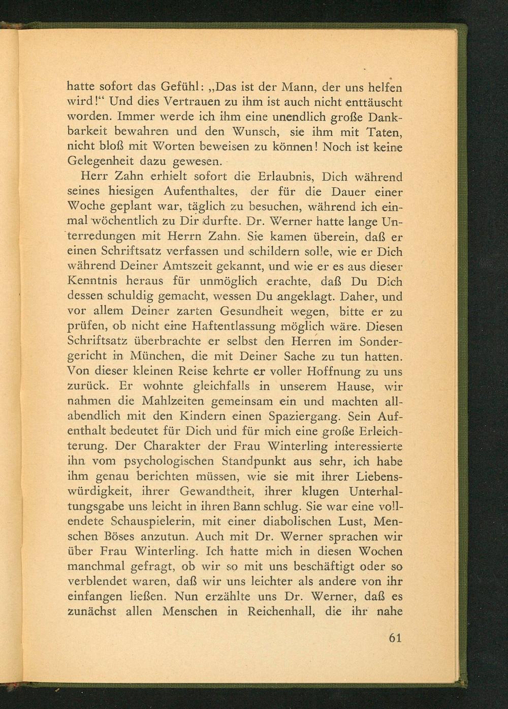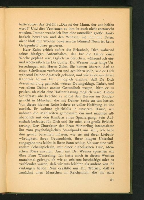 Herr Zahn erhielt sofort die Erlaubnis, Dich während seines hiesigen Aufenthaltes, der für die Dauer einer Woche geplant war, täglich zu besuchen, während ich einmal wöchentlich zu Dir durfte. Dr. Werner hatte lange Unterredungen mit Herrn Zahn. Sie kamen überein, daß er einen Schriftsatz verfassen und schildern solle, wie er Dich während Deiner Amtszeit gekannt, und wie er es aus dieser Kenntnis heraus für unmöglich erachte, daß Du Dich dessen schuldig gemacht, wessen Du angeklagt. Daher, und vor allem Deiner zarten Gesundheit wegen, bitte er zu prüfen, ob nicht eine Haftentlassung möglich wäre. Diesen Schriftsatz überbrachte er selbst den Herren im Sondergericht in München , die mit Deiner Sache zu tun hatten. Von dieser kleinen Reise kehrte er voller Hoffnung zu uns zurück. Er wohnte gleichfalls in unserem Hause, wir nahmen die Mahlzeiten gemeinsam ein und machten allabendlich mit den Kindern einen Spaziergang. Sein Aufenthalt bedeutet für Dich und für mich eine große Erleichterung. Der Charakter der Frau Winterling interessierte ihn vom psychologischen Standpunkt aus sehr, ich habe ihm genau berichten müssen, wie sie mit ihrer Liebenswürdigkeit, ihrer Gewandtheit, ihrer klugen Unterhaltungsgabe uns leicht in ihren Bann schlug. Sie war eine vollendete Schauspielerin, mit einer diabolischen Lust, Menschen Böses anzutun. Auch mit Dr. Werner sprachen wir über Frau Winterling. Ich hatte mich in diesen Wochen manchmal gefragt, ob wir so mit uns beschäftigt oder so verblendet waren, daß wir uns leichter als andere von ihr einfangen ließen. Nun erzählte uns Dr. Werner, daß es zunächst allen Menschen in Reichenhall , die ihr nahe
