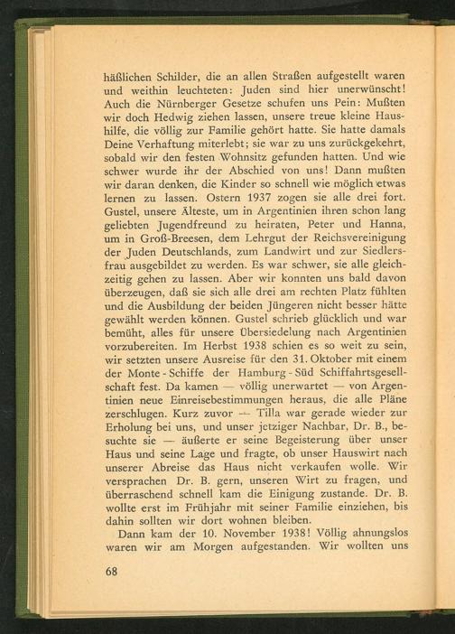 häßlichen Schilder, die an allen Straßen aufgestellt waren. und weithin leuchteten: Juden sind hier unerwünscht! Auch die Nürnberger Gesetze schufen uns Pein: Mußten wir doch Hedwig ziehen lassen, unsere treue kleine Haushilfe, die völlig zur Familie gehört hatte. Sie hatte damals Deine Verhaftung miterlebt; sie war zu uns zurückgekehrt, sobald wir den festen Wohnsitz gefunden hatten. Und wie schwer wurde ihr der Abschied von uns! Dann mußten wir daran denken, die Kinder so schnell wie möglich etwas lernen zu lassen. Ostern 1937 zogen sie alle drei fort. Gustel, unsere Älteste, um in Argentinien ihren schon lang geliebten Jugendfreund zu heiraten, Peter und Hanna, um in Groß- Breesen, dem Lehrgut der Reichsvereinigung der Juden Deutschlands , zum Landwirt und zur Siedlersfrau ausgebildet zu werden. Es war schwer, sie alle gleichzeitig gehen zu lassen. Aber wir konnten uns bald davon überzeugen, daß sie sich alle drei am rechten Platz fühlten und die Ausbildung der beiden Jüngeren nicht besser hätte gewählt werden können. Gustel schrieb glücklich und war bemüht, alles für unsere Übersiedelung nach Argentinien vorzubereiten. Im Herbst 1938 schien es so weit zu sein, wir setzten unsere Ausreise für den 31. Oktober mit einem der Monte- Schiffe der Hamburg- Süd Schiffahrtsgesellschaft fest. Da kamen völlig unerwartet von Argentinien neue Einreisebestimmungen heraus, die alle Pläne zerschlugen. Kurz zuvor Tilla war gerade wieder zur Erholung bei uns, und unser jetziger Nachbar, Dr. B., besuchte sie äußerte er seine Begeisterung über unser Haus und seine Lage und fragte, ob unser Hauswirt nach unserer Abreise das Haus nicht verkaufen wolle. Wir versprachen Dr. B. gern, unseren Wirt zu fragen, und überraschend schnell kam die Einigung zustande. Dr. B. wollte erst im Frühjahr mit seiner Familie einziehen, bis dahin sollten wir dort wohnen bleiben.