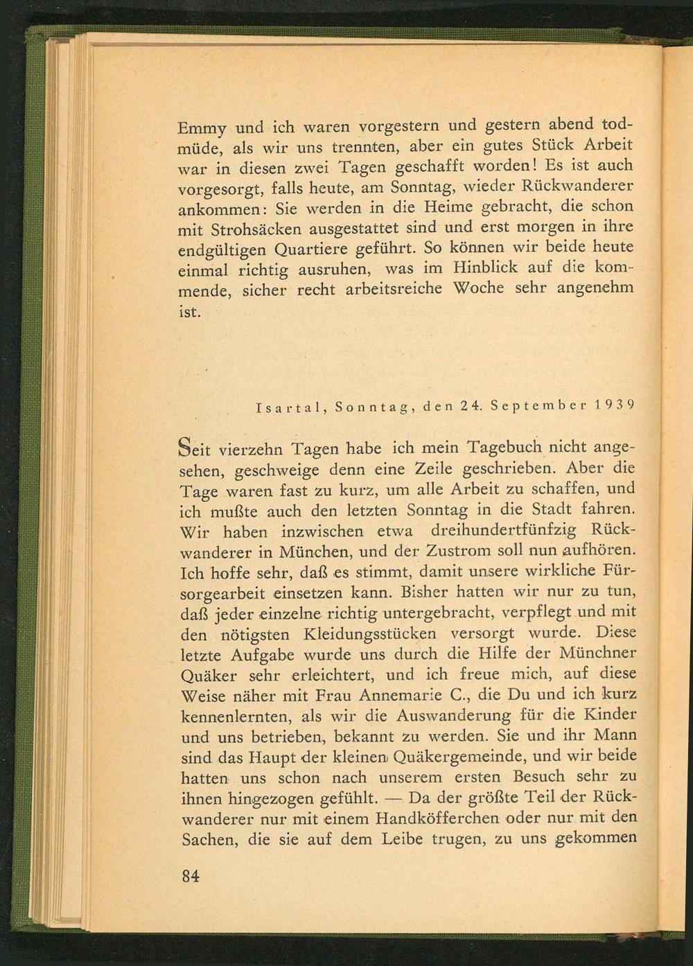 Seit vierzehn Tagen habe ich mein Tagebuch nicht angesehen, geschweige denn eine Zeile geschrieben. Aber die Tage waren fast zu kurz, um alle Arbeit zu schaffen, und ich mußte auch den letzten Sonntag in die Stadt fahren. Wir haben inzwischen etwa dreihundertfünfzig Rückwanderer in München , und der Zustrom soll nun aufhören. Ich hoffe sehr, daß es stimmt, damit unsere wirkliche Fürsorgearbeit einsetzen kann. Bisher hatten wir nur zu tun, daß jeder einzelne richtig untergebracht, verpflegt und mit den nötigsten Kleidungsstücken versorgt wurde. Diese letzte Aufgabe wurde uns durch die Hilfe der Münchner Quäker sehr erleichtert, und ich freue mich, auf diese Weise näher mit Frau Annemarie C., die Du und ich kurz kennenlernten, als wir die Auswanderung für die Kinder und uns betrieben, bekannt zu werden. Sie und ihr Mann sind das Haupt der kleinen Quäkergemeinde, und wir beide hatten uns schon nach unserem ersten Besuch sehr zu ihnen hingezogen gefühlt.- Da der größte Teil der Rückwanderer nur mit einem Handköfferchen oder nur mit den Sachen, die sie auf dem Leibe trugen, zu uns gekommen