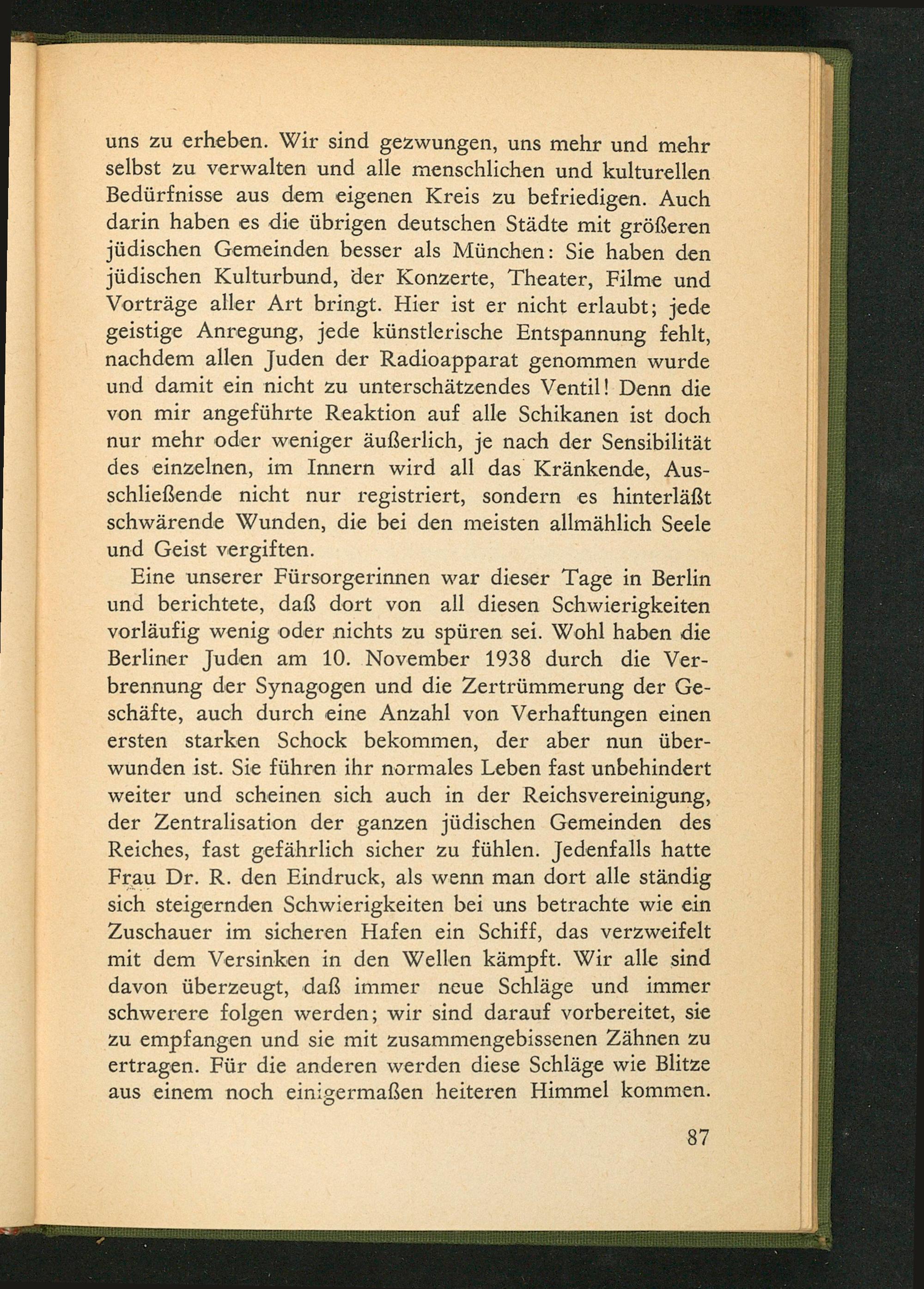 uns zu erheben. Wir sind gezwungen, uns mehr und mehr selbst zu verwalten und alle menschlichen und kulturellen Bedürfnisse aus dem eigenen Kreis zu befriedigen. Auch darin haben es die übrigen deutschen Städte mit größeren jüdischen Gemeinden besser als München : Sie haben den jüdischen Kulturbund, der Konzerte, Theater, Filme und Vorträge aller Art bringt. Hier ist er nicht erlaubt; jede geistige Anregung, jede künstlerische Entspannung fehlt, nachdem allen Juden der Radioapparat genommen wurde und damit ein nicht zu unterschätzendes Ventil! Denn die von mir angeführte Reaktion auf alle Schikanen ist doch nur mehr oder weniger äußerlich, je nach der Sensibilität des einzelnen, im Innern wird all das Kränkende, Aus- schließende nicht nur registriert, sondern es hinterläßt schwärende Wunden, die bei den meisten allmählich Seele und Geist vergiften.