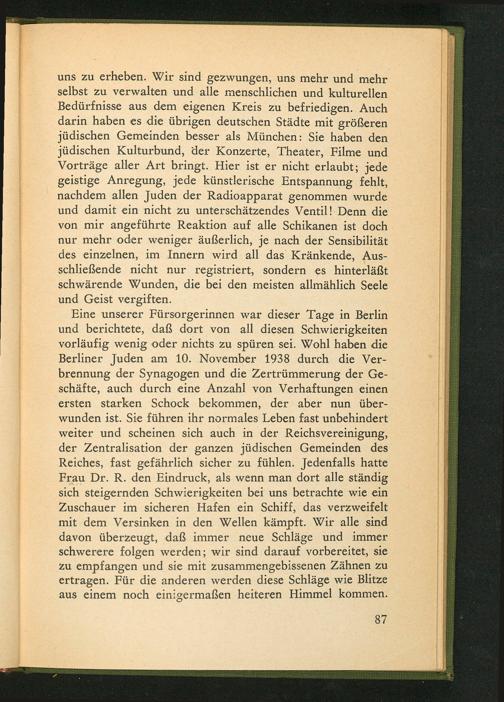 Eine unserer Fürsorgerinnen war dieser Tage in Berlin und berichtete, daß dort von all diesen Schwierigkeiten vorläufig wenig oder nichts zu spüren sei. Wohl haben die Berliner Juden am 10. November 1938 durch die Ver- brennung der Synagogen und die Zertrümmerung der Ge- schäfte, auch durch eine Anzahl von Verhaftungen einen ersten starken Schock bekommen, der aber nun über- wunden ist. Sie führen ihr normales Leben fast unbehindert weiter und scheinen sich auch in der Reichsvereinigung, der Zentralisation der ganzen jüdischen Gemeinden des Reiches, fast gefährlich sicher zu fühlen. Jedenfalls hatte Frau Dr. R. den Eindruck, als wenn man dort alle ständig sich steigernden Schwierigkeiten bei uns betrachte wie ein Zuschauer im sicheren Hafen ein Schiff, das verzweifelt mit dem Versinken in den Wellen kämpft. Wir alle sind davon überzeugt, daß immer neue Schläge und immer schwerere folgen werden; wir sind darauf vorbereitet, sie zu empfangen und sie mit zusammengebissenen Zähnen zu ertragen. Für die anderen werden diese Schläge wie Blitze aus einem noch einigermaßen heiteren Himmel kommen.