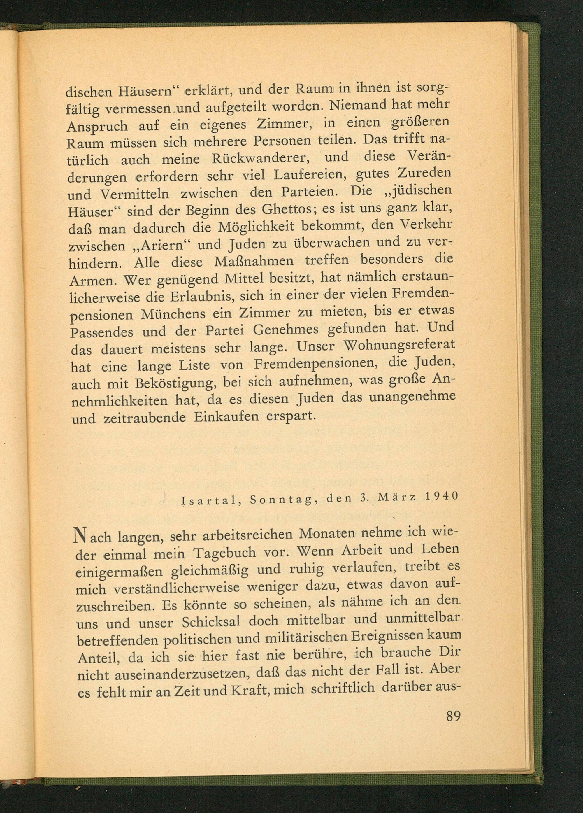 Nach langen, sehr arbeitsreichen Monaten nehme ich wie- der einmal mein Tagebuch vor. Wenn Arbeit und Leben einigermaßen gleichmäßig und ruhig verlaufen, treibt es mich verständlicherweise weniger dazu, etwas davon auf- zuschreiben. Es könnte so scheinen, als nähme ich an den. uns und unser Schicksal doch mittelbar und unmittelbar betreffenden politischen und militärischen Ereignissen kaum Anteil, da ich sie hier fast nie berühre, ich brauche Dir nicht auseinanderzusetzen, daß das nicht der Fall ist. Aber es fehlt mir an Zeit und Kraft, mich schriftlich darüber aus-
