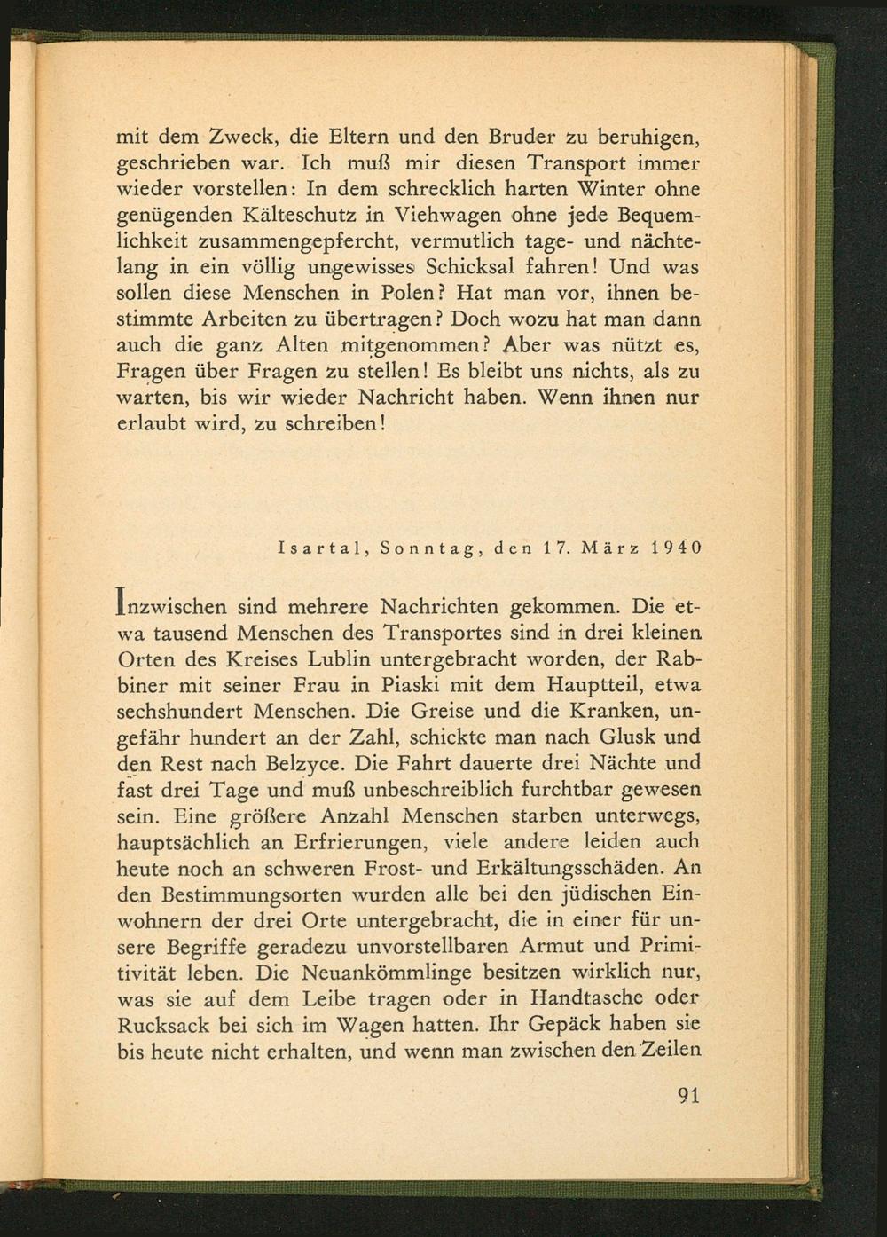 Inzwischen sind mehrere Nachrichten gekommen. Die etwa tausend Menschen des Transportes sind in drei kleinen Orten des Kreises Lublin untergebracht worden, der Rabbiner mit seiner Frau in Piaski mit dem Hauptteil, etwa sechshundert Menschen. Die Greise und die Kranken, ungefähr hundert an der Zahl, schickte man nach Glusk und den Rest nach Belzyce . Die Fahrt dauerte drei Nächte und fast drei Tage und muß unbeschreiblich furchtbar gewesen sein. Eine größere Anzahl Menschen starben unterwegs, hauptsächlich an Erfrierungen, viele andere leiden auch heute noch an schweren Frost- und Erkältungsschäden. An den Bestimmungsorten wurden alle bei den jüdischen Einwohnern der drei Orte untergebracht, die in einer für unsere Begriffe geradezu unvorstellbaren Armut und Primitivität leben. Die Neuankömmlinge besitzen wirklich nur, was sie auf dem Leibe tragen oder in Handtasche oder Rucksack bei sich im Wagen hatten. Ihr Gepäck haben sie bis heute nicht erhalten, und wenn man zwischen den Zeilen