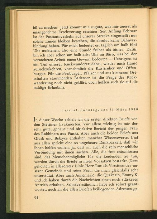 In dieser Woche erhielt ich die ersten direkten Briefe von den Stettiner Evakuierten. Vor allem wichtig ist mir der sehr gute, genaue und objektive Bericht der jungen Frau des Rabbiners aus Piaski . Aber auch die beiden Briefe aus Glusk und Belzyce enthalten manches Wissenswerte. Und aus allen spricht eine so ungeheure Dankbarkeit, daß wir ihnen helfen wollen, ja, daß wir auch die rein menschliche Verbindung mit ihnen suchen. Alle, die fest entschlossen sind, das Menschenmögliche für die Leidenden zu tun, werden durch die Briefe in ihren Vorsätzen bestärkt. Dazu gehörten in allererster Linie Herr Rat als Vorsitzender unserer Gemeinde und seine Frau, die mich gleichfalls sehr unterstützt. Aber auch Annemarie, die Quäkerin, Emmy K. und ich haben durch die Nachrichten einen noch stärkeren Antrieb erhalten. Selbstverständlich habe ich sofort geantwortet, auch an die allen Briefen beiliegenden Adressen ge