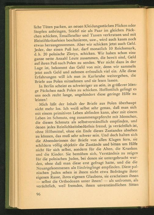 liche Tüten packen, an neuen Kleidungsstücken Flicken oder Stopfen anbringen, Stiefel nie als Paar im gleichen Päckchen schicken, Emailleteller und Tassen verkratzen und mit Bleistiftkritzeleien beschmieren, usw., wird auch kaum noch etwas herausgenommen. Aber wir schicken jetzt auch Geld. Jeder, der einen Paß hat, darf monatlich 10 Reichsmark, d. h. 20 polnische Zlotys, schicken. Wir haben schon eine ganze nette Anzahl Leute zusammen, die bereit sind, Geld auf ihren Paß nach Polen zu senden. Wer nicht dazu in der Lage ist, bekommt das Geld von mir, denn wir sammeln jetzt auch Geld und nehmen erfreulich viel ein. Alle diese Erfahrungen will ich nun in Karlsruhe weitergeben, die Briefe aus Polen mitnehmen und sie lesen lassen.