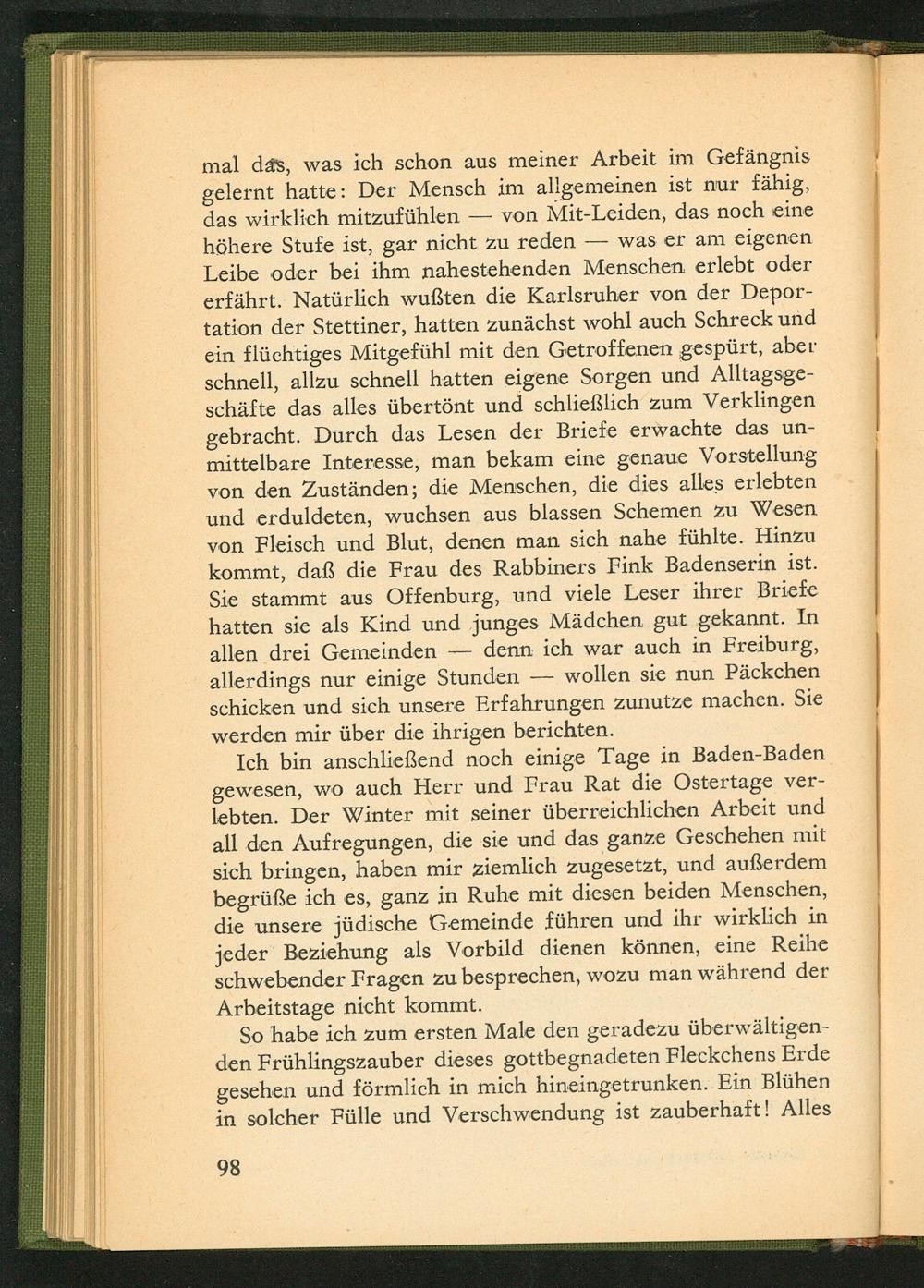 mal das, was ich schon aus meiner Arbeit im Gefängnis gelernt hatte: Der Mensch im allgemeinen ist nur fähig, das wirklich mitzufühlen von Mit- Leiden, das noch eine höhere Stufe ist, gar nicht zu reden was er am eigenen Leibe oder bei ihm nahestehenden Menschen erlebt oder erfährt. Natürlich wußten die Karlsruher von der Deportation der Stettiner, hatten zunächst wohl auch Schreck und ein flüchtiges Mitgefühl mit den Getroffenen gespürt, aber schnell, allzu schnell hatten eigene Sorgen und Alltagsgeschäfte das alles übertönt und schließlich zum Verklingen gebracht. Durch das Lesen der Briefe erwachte das unmittelbare Interesse, man bekam eine genaue Vorstellung von den Zuständen; die Menschen, die dies alles erlebten und erduldeten, wuchsen aus blassen Schemen zu Wesen von Fleisch und Blut, denen man sich nahe fühlte. Hinzu kommt, daß die Frau des Rabbiners Fink Badenserin ist. Sie stammt aus Offenburg , und viele Leser ihrer Briefe hatten sie als Kind und junges Mädchen gut gekannt. In allen drei Gemeinden denn ich war auch in Freiburg , wollen sie nun Päckchen allerdings nur einige Stunden schicken und sich unsere Erfahrungen zunutze machen. Sie werden mir über die ihrigen berichten.