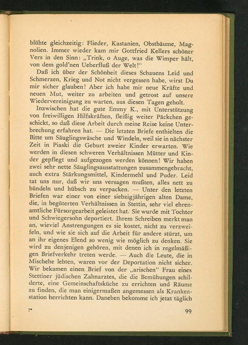 Inzwischen hat die gute Emmy K., mit Unterstützung von freiwilligen Hilfskräften, fleißig weiter Päckchen geschickt, so daß diese Arbeit durch meine Reise keine Unterbrechung erfahren hat. Die letzten Briefe enthielten die Bitte um Säuglingswäsche und Windeln, weil sie in nächster Zeit in Piaski die Geburt zweier Kinder erwarten. Wie werden in diesen schweren Verhältnissen Mütter und Kinder gepflegt und aufgezogen werden können! Wir haben zwei sehr nette Säuglingsausstattungen zusammengebracht, auch extra Stärkungsmittel, Kindermehl und Puder. Leid tat uns nur, daß wir uns versagen mußten, alles nett zu bündeln und hübsch zu verpacken. Unter den letzten Briefen war einer von einer siebzigjährigen alten Dame, die, in begüterten Verhältnissen in Stettin , sehr viel ehrenamtliche Fürsorgearbeit geleistet hat. Sie wurde mit Tochter und Schwiegersohn deportiert. Ihrem Schreiben merkt man an, wieviel Anstrengungen es sie kostet, nicht zu verzweifeln, und wie sie sich auf die Arbeit für andere stürzt, um an ihr eigenes Elend so wenig wie möglich zu denken. Sie wird zu denjenigen gehören, mit denen ich in regelmäßigen Briefverkehr treten werde. Auch die Leute, die in Mischehe lebten, waren vor der Deportation nicht sicher. Wir bekamen einen Brief von der ,, arischen" Frau eines Stettiner jüdischen Zahnarztes, die die Bemühungen schilderte, eine Gemeinschaftsküche zu errichten und Räume zu finden, die man einigermaßen angemessen als Krankenstation herrichten kann. Daneben bekomme ich jetzt täglich