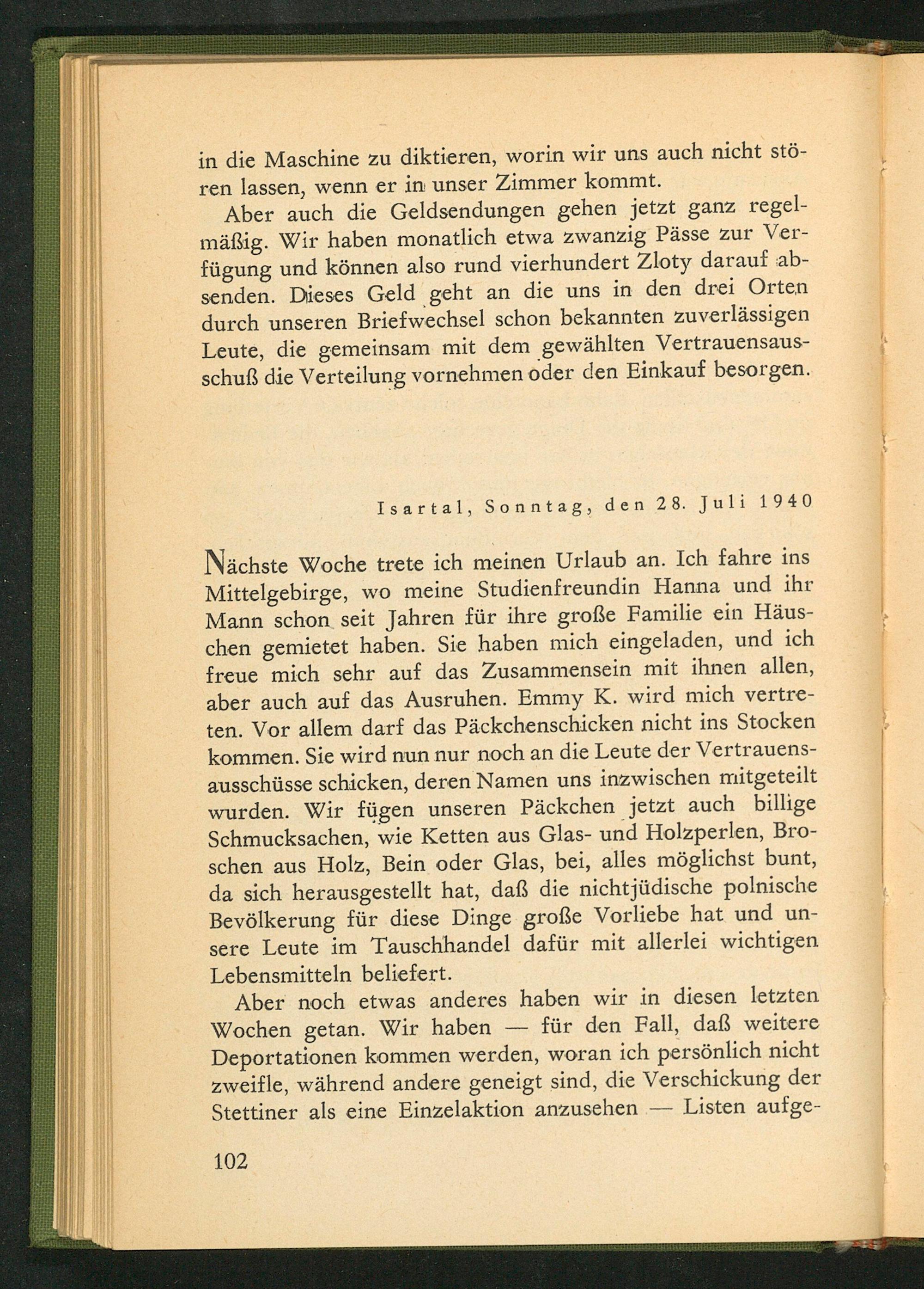 Nächste Woche trete ich meinen Urlaub an. Ich fahre ins Mittelgebirge , wo meine Studienfreundin Hanna und ihr Mann schon seit Jahren für ihre große Familie ein Häuschen gemietet haben. Sie haben mich eingeladen, und ich freue mich sehr auf das Zusammensein mit ihnen allen, aber auch auf das Ausruhen. Emmy K. wird mich vertreten. Vor allem darf das Päckchenschicken nicht ins Stocken kommen. Sie wird nun nur noch an die Leute der Vertrauensausschüsse schicken, deren Namen uns inzwischen mitgeteilt wurden. Wir fügen unseren Päckchen jetzt auch billige Schmucksachen, wie Ketten aus Glas- und Holzperlen, Broschen aus Holz, Bein oder Glas, bei, alles möglichst bunt, da sich herausgestellt hat, daß die nichtjüdische polnische Bevölkerung für diese Dinge große Vorliebe hat und unsere Leute im Tauschhandel dafür mit allerlei wichtigen Lebensmitteln beliefert.