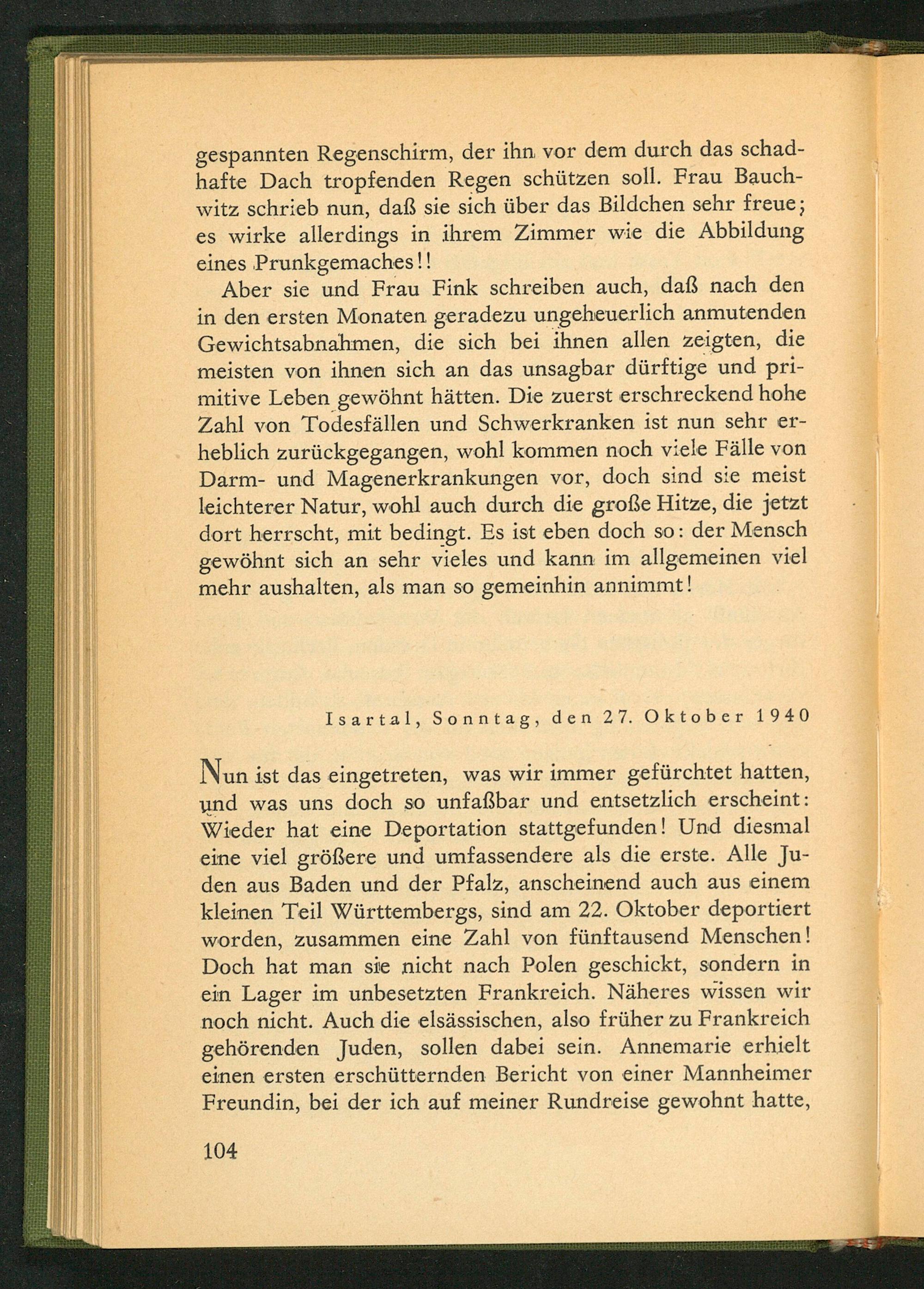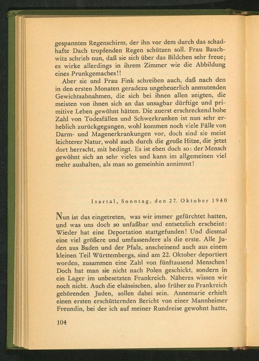und was uns doch so unfaßbar und entsetzlich erscheint: Wieder hat eine Deportation stattgefunden! Und diesmal eine viel größere und umfassendere als die erste. Alle Juden aus Baden und der Pfalz , anscheinend auch aus einem. kleinen Teil Württembergs, sind am 22. Oktober deportiert worden, zusammen eine Zahl von fünftausend Menschen! Doch hat man sie nicht nach Polen geschickt, sondern in ein Lager im unbesetzten Frankreich . Näheres wissen wir noch nicht. Auch die elsässischen, also früher zu Frankreich gehörenden Juden, sollen dabei sein. Annemarie erhielt einen ersten erschütternden Bericht von einer Mannheimer Freundin, bei der ich auf meiner Rundreise gewohnt hatte,