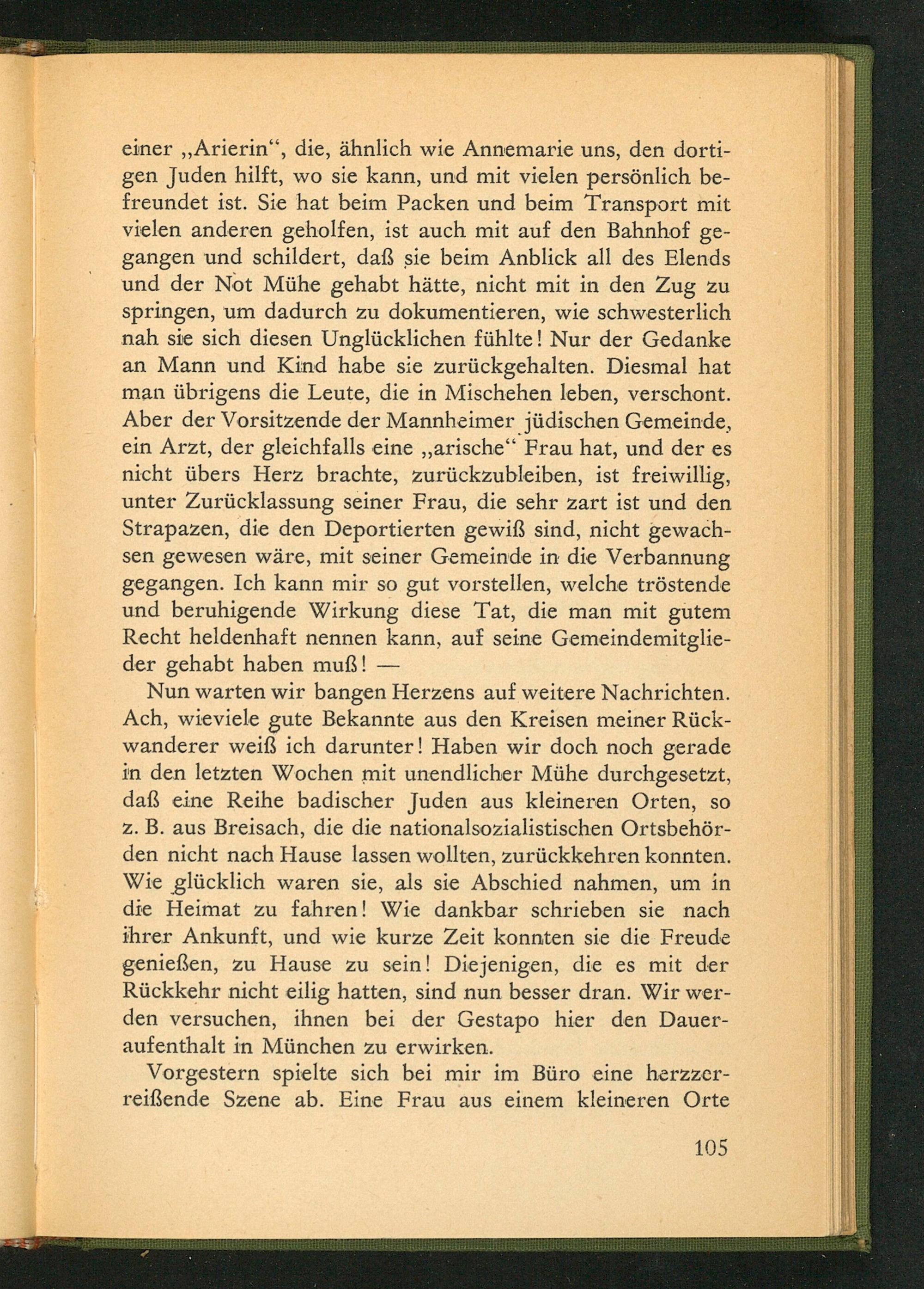 einer ,, Arierin", die, ähnlich wie Annemarie uns, den dorti­gen Juden hilft, wo sie kann, und mit vielen persönlich be­freundet ist. Sie hat beim Packen und beim Transport mit vielen anderen geholfen, ist auch mit auf den Bahnhof ge­gangen und schildert, daß sie beim Anblick all des Elends und der Not Mühe gehabt hätte, nicht mit in den Zug zu springen, um dadurch zu dokumentieren, wie schwesterlich nah sie sich diesen Unglücklichen fühlte! Nur der Gedanke an Mann und Kind habe sie zurückgehalten. Diesmal hat man übrigens die Leute, die in Mischehen leben, verschont. Aber der Vorsitzende der Mannheimer jüdischen Gemeinde, ein Arzt, der gleichfalls eine ,, arische" Frau hat, und der es nicht übers Herz brachte, zurückzubleiben, ist freiwillig, unter Zurücklassung seiner Frau, die sehr zart ist und den Strapazen, die den Deportierten gewiß sind, nicht gewach­sen gewesen wäre, mit seiner Gemeinde in die Verbannung gegangen. Ich kann mir so gut vorstellen, welche tröstende und beruhigende Wirkung diese Tat, die man mit gutem Recht heldenhaft nennen kann, auf seine Gemeindemitglie­der gehabt haben muß!