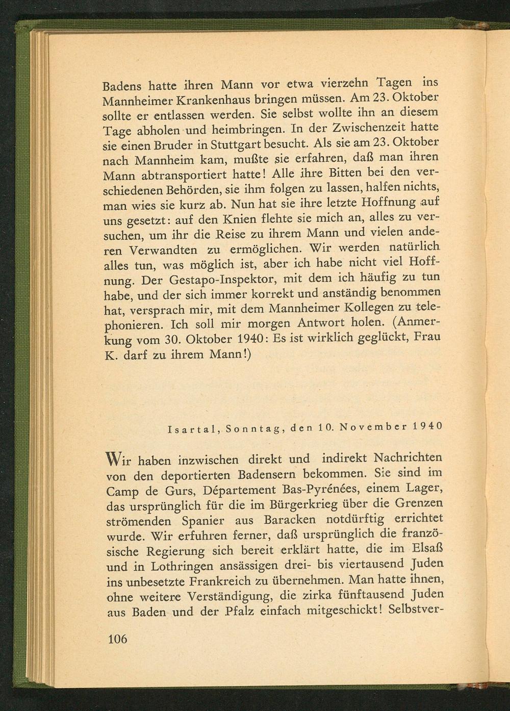 Badens hatte ihren Mann vor etwa vierzehn Tagen ins Mannheimer Krankenhaus bringen müssen. Am 23. Oktober sollte er entlassen werden. Sie selbst wollte ihn an diesem Tage abholen und heimbringen. In der Zwischenzeit hatte sie einen Bruder in Stuttgart besucht. Als sie am 23. Oktober nach Mannheim kam, mußte sie erfahren, daß man ihren Mann abtransportiert hatte! Alle ihre Bitten bei den ver- schiedenen Behörden, sie ihm folgen zu lassen, halfen nichts, man wies sie kurz ab. Nun hat sie ihre letzte Hoffnung auf uns gesetzt: auf den Knien flehte sie mich an, alles zu ver- suchen, um ihr die Reise zu ihrem Mann und vielen ande- ren Verwandten zu ermöglichen. Wir werden natürlich alles tun, was möglich ist, aber ich habe nicht viel Hoff- nung. Der Gestapo -Inspektor, mit dem ich häufig zu tun habe, und der sich immer korrekt und anständig benommen hat, versprach mir, mit dem Mannheimer Kollegen zu tele- phonieren. Ich soll mir morgen Antwort holen.(Anmer- kung vom 30. Oktober 1940: Es ist wirklich geglückt, Frau K. darf zu ihrem Mann!)