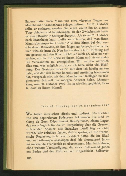 Wir haben inzwischen direkt und indirekt Nachrichten von den deportierten Badensern bekommen. Sie sind im Camp de Gurs , Departement Bas-Pyren£es, einem Lager, das ursprünglich für die im Bürgerkrieg über die Grenzen strömenden Spanier aus Baracken notdürftig errichtet wurde. Wir erfuhren ferner, daß ursprünglich die franzö- sische Regierung sich bereit erklärt hatte, die im Elsaß und in Lothringen ansässigen drei- bis viertausend Juden ins unbesetzte Frankreich zu übernehmen. Man hatte ihnen, ohne weitere Verständigung, die zirka fünftausend Juden aus Baden und der Pfalz einfach mitgeschickt! Selbstver-